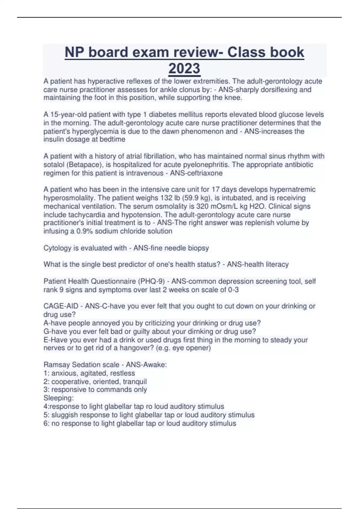 NP board exam review- Class book 2023 A patient has hyperactive reflexes of the lower extremities. The adult-gerontology acute care nurse practitioner assesses for ankle clonus by: - ANS-sharply dorsiflexing and maintaining the foot in this position, while supporting the knee. A 15-year-old patient with type 1 diabetes mellitus reports elevated blood glucose levels in the morning. The adult-gerontology acute care nurse practitioner determines that the patient's hyperglycemia is due to the dawn phenomenon and - ANS-increases the insulin dosage at bedtime A patient with a history of atrial fibrillation, who has maintained normal sinus rhythm with sotalol (Betapace), is hospitalized for acute pyelonephritis. The appropriate antibiotic regimen for this patient is intravenous - ANS-ceftriaxone A patient who has been in the intensive care unit for 17 days develops hypernatremic hyperosmolality. The patient weighs 132 lb (59.9 kg), is intubated, and is receiving mechanical ventilation. The serum osmolality is 320 mOsm/L kg H2O. Clinical signs include tachycardia and hypotension. The adult-gerontology acute care nurse practitioner's initial treatment is to - ANS-The right answer was replenish volume by infusing a 0.9% sodium chloride solution Cytology is evaluated with - ANS-fine needle biopsy What is the single best predictor of one's health status? - ANS-health literacy Patient Health Questionnaire (PHQ-9) - ANS-common depression screening tool, self rank 9 signs and symptoms over last 2 weeks on scale of 0-3 CAGE-AID - ANS-C-have you ever felt that you ought to cut down on your drinking or drug use? A-have people annoyed you by criticizing your drinking or drug use? G-have you ever felt bad or guilty about your dirnking or drug use? E-Have you ever had a drink or used drugs first thing in the morning to steady your nerves or to get rid of a hangover? (e.g. eye opener) Ramsay Sedation scale - ANS-Awake: 1: anxious, agitated, restless 2: cooperative, oriented, tranquil 3: responsive to commands only Sleeping: 4:response to light glabellar tap ro loud auditory stimulus 5: sluggish response to light glabellar tap or loud auditory stimulus 6: no response to light glabellar tap or loud auditory stimulus CONTINUES...