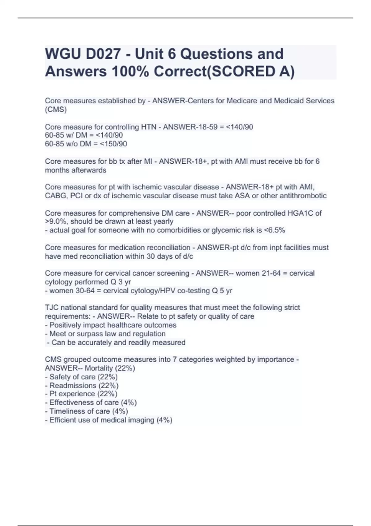 Core measures established by - ANSWER-Centers for Medicare and Medicaid Services (CMS) Core measure for controlling HTN - ANSWER-18-59 = <140/90 60-85 w/ DM = <140/90 60-85 w/o DM = <150/90 Core measures for bb tx after MI - ANSWER-18+, pt with AMI must receive bb for 6 months afterwards Core measures for pt with ischemic vascular disease - ANSWER-18+ pt with AMI, CABG, PCI or dx of ischemic vascular disease must take ASA or other antithrombotic Core measures for comprehensive DM care - ANSWER-- poor controlled HGA1C of >9.0%, should be drawn at least yearly - actual goal for someone with no comorbidities or glycemic risk is <6.5% Core measures for medication reconciliation - ANSWER-pt d/c from inpt facilities must have med reconciliation within 30 days of d/c Core measure for cervical cancer screening - ANSWER-- women 21-64 = cervical cytology performed Q 3 yr - women 30-64 = cervical cytology/HPV co-testing Q 5 yr TJC natio