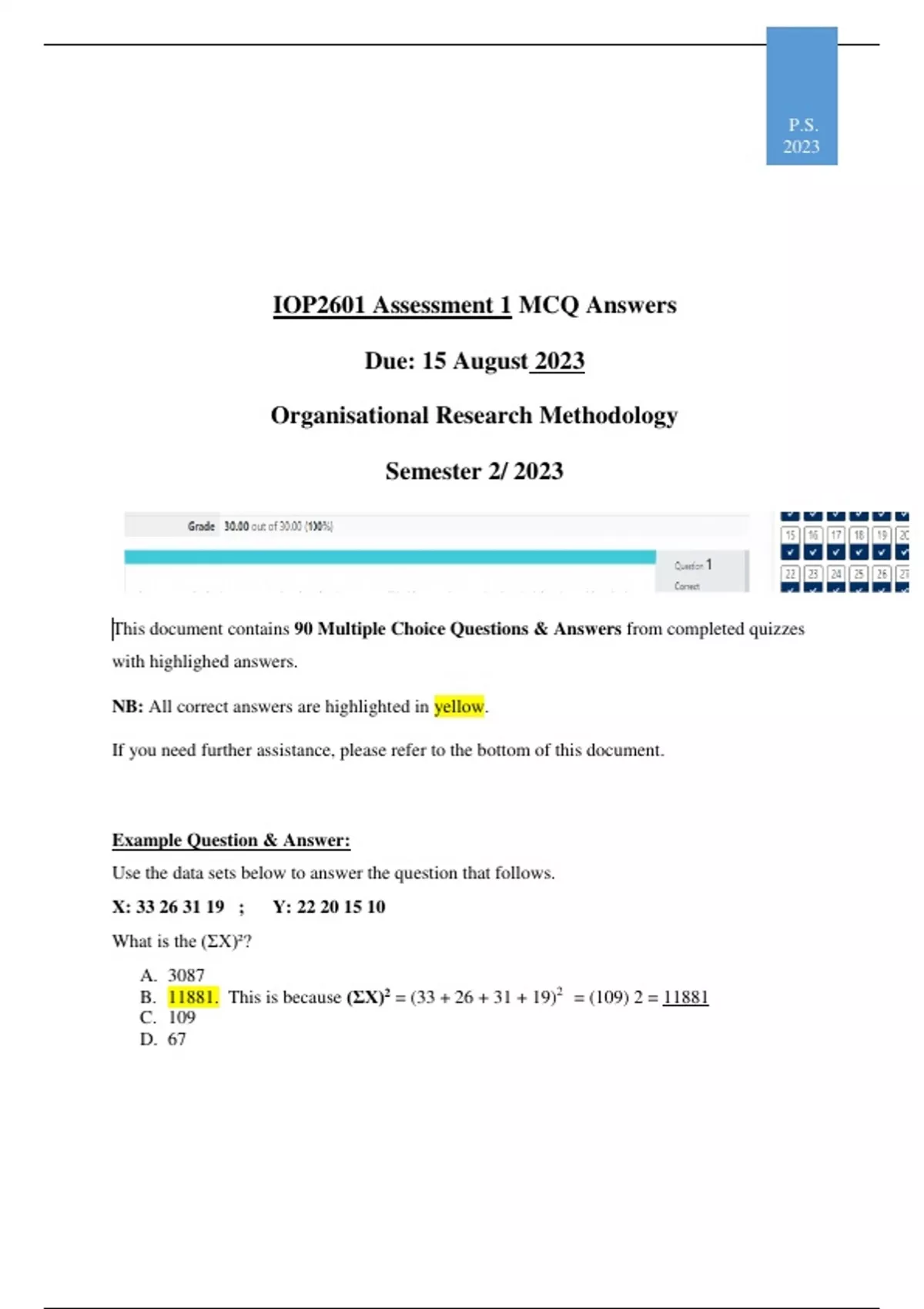 This document contains 90 Multiple Choice Questions & Answers from completed quizzes with highlighted answers. It includes complete answers and guidelines for the IOP2601 Assessment 1 due 15 August 2023. TRUSTED & QUALITY SOLUTIONS. All quizzes were completed on the 12th of August 2023.