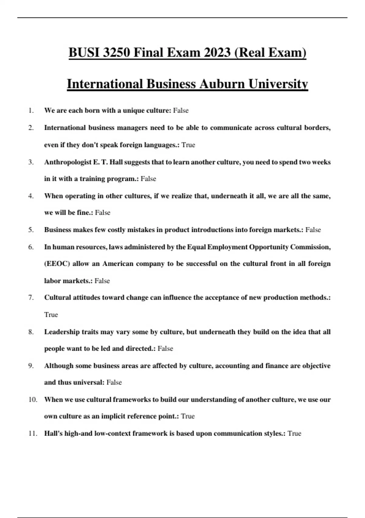 BUSI 3250 Final Exam 2023 (Real Exam) International Business Auburn University