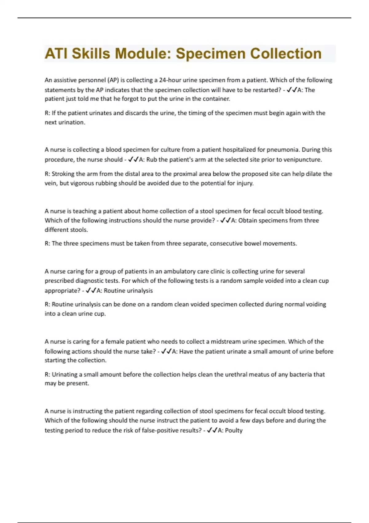 ATI Skills Module: Specimen Collection EXAM(Answered;graded A+)