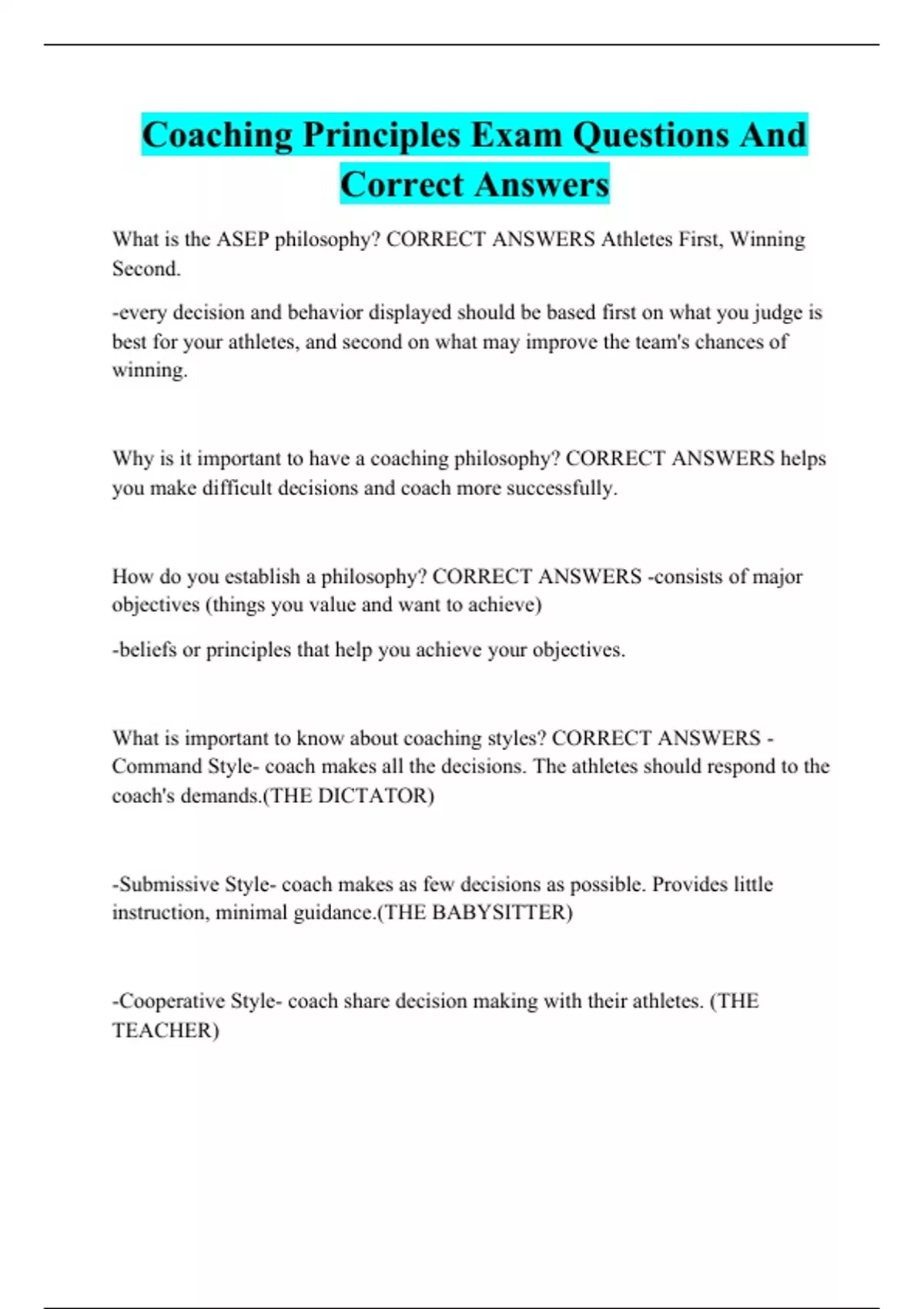 Coaching Principles Exam Questions And Correct Answers