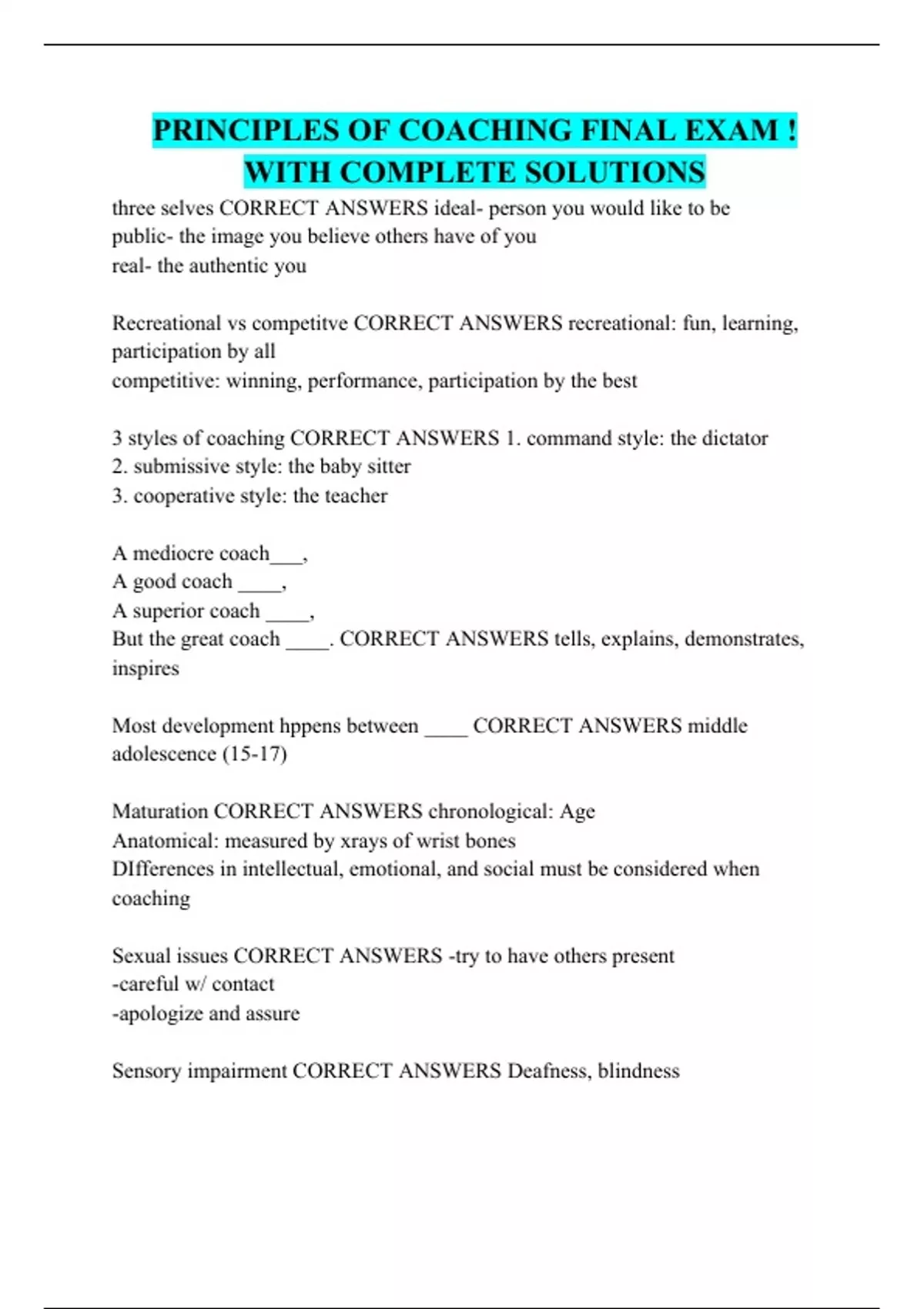 PRINCIPLES OF COACHING FINAL EXAM ! WITH COMPLETE SOLUTIONS