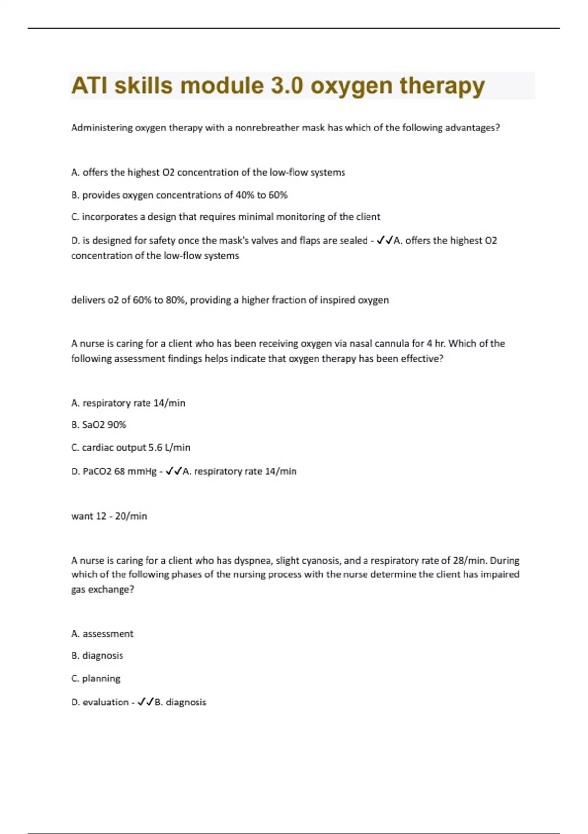 Administering oxygen therapy with a nonrebreather mask has which of the following advantages? A. offers the highest O2 concentration of the low-flow systems B. provides oxygen concentrations of 40% to 60% C. incorporates a design that requires minimal monitoring of the client D. is designed for safety once the mask's valves and flaps are sealed - A. offers the highest O2 concentration of the low-flow systems delivers o2 of 60% to 80%, providing a higher fraction of inspired oxygen A nurse is caring for a client who has been receiving oxygen via nasal cannula for 4 hr. Which of the following assessment findings helps indicate that oxygen therapy has been effective? A. respiratory rate 14/min B. SaO2 90% C. cardiac output 5.6 L/min D. PaCO2 68 mmHg - A. respiratory rate 14/min want 12 - 20/min A nurse is caring for a client who has dyspnea, slight cyanosis, and a respiratory rate of 28/min. During which of the following phases of the nursing process with the nurse determine the client has impaired gas exchange? A. assessment B. diagnosis C. planning D. evaluation - B. diagnosisnurse analyzes and inte