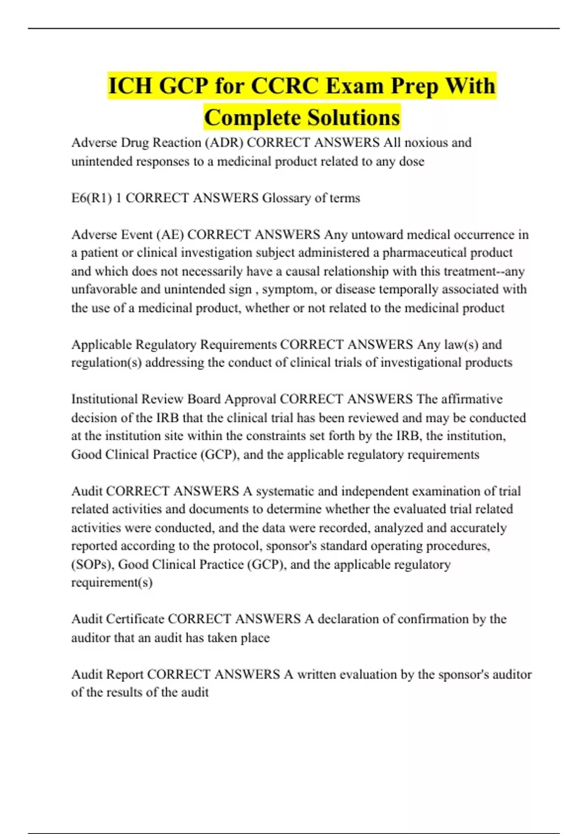 ICH GCP for CCRC Exam Prep With Complete Solutions