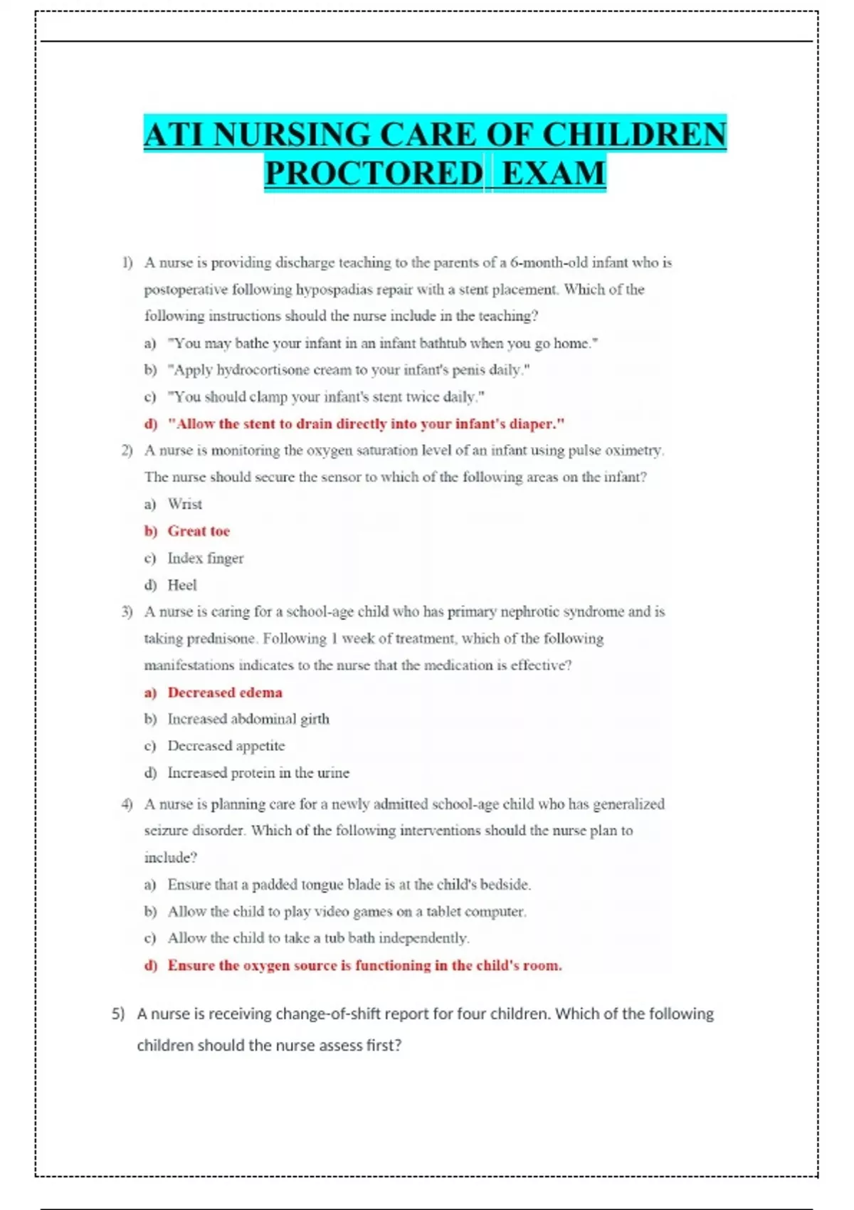 ATI NURSING CARE OF CHILDREN PROCTORED EXAM 5) A nurse is receiving change-of-shift report for four children. Which of the following children should the nurse assess first? a. A toddler who has a concussion and an episode of forceful vomiting b. An adolescent who has infective endocarditis and reports having a headache c. An adolescent who was placed into halo traction 1 hr ago and reports pain as 6 on a scale of 0 to 10 d. A school-age child who has acute glomerulonephritis and brown-colored urine 6) A nurse is providing dietary teaching to the guardian of a school-age child who has cystic fibrosis. Which of the following statements should the nurse make? a. "You should offer your child high-protein meals and snacks throughout the day." b. "You should decrease your child's dietary fat intake to less than 10% of their caloric intake." c. "You should restrict your child's calorie intake to 1,200 per day." d. "You should give your child a multivitamin once weekly." 7) A nurse is providing discharge teaching to the guardians of a toddler who had lower leg cast applied 24 hr ago. The nurse should instruct the guardians to report which of the following finding to the provider? a. Capillary refill time less than 2 seconds b. Restricted ability to move the toes c. Swelling of the casted foot when the leg is dependent d. Pedal pulse +3 bilateral