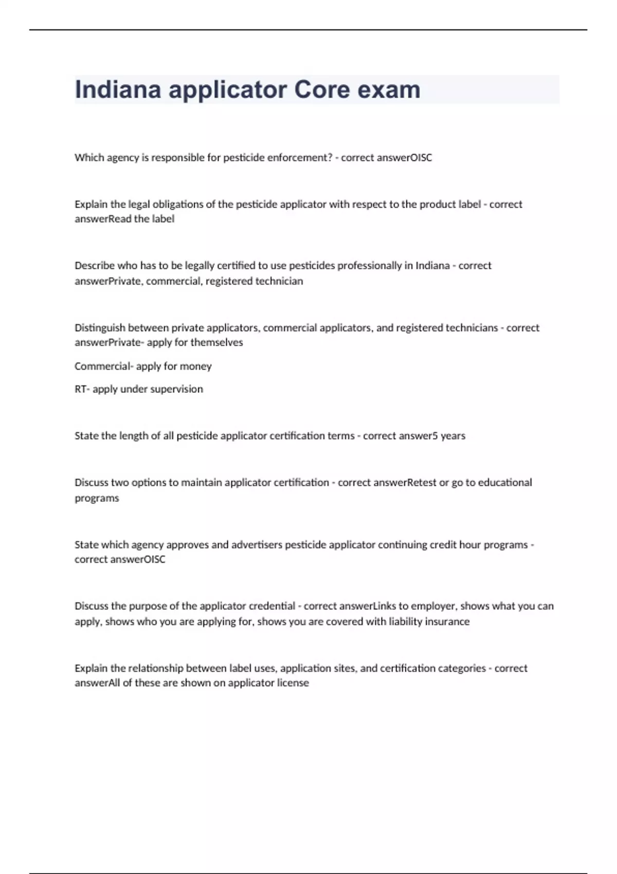 Which agency is responsible for pesticide enforcement? - correct answerOISC Explain the legal obligations of the pesticide applicator with respect to the product label - correct answerRead the label Describe who has to be legally certified to use pesticides professionally in Indiana - correct answerPrivate, commercial, registered technician Distinguish between private applicators, commercial applicators, and registered technicians - correct answerPrivate- apply for themselves Commercial- apply for money RT- apply under supervision State the length of all pesticide applicator certification terms - correct answer5 years