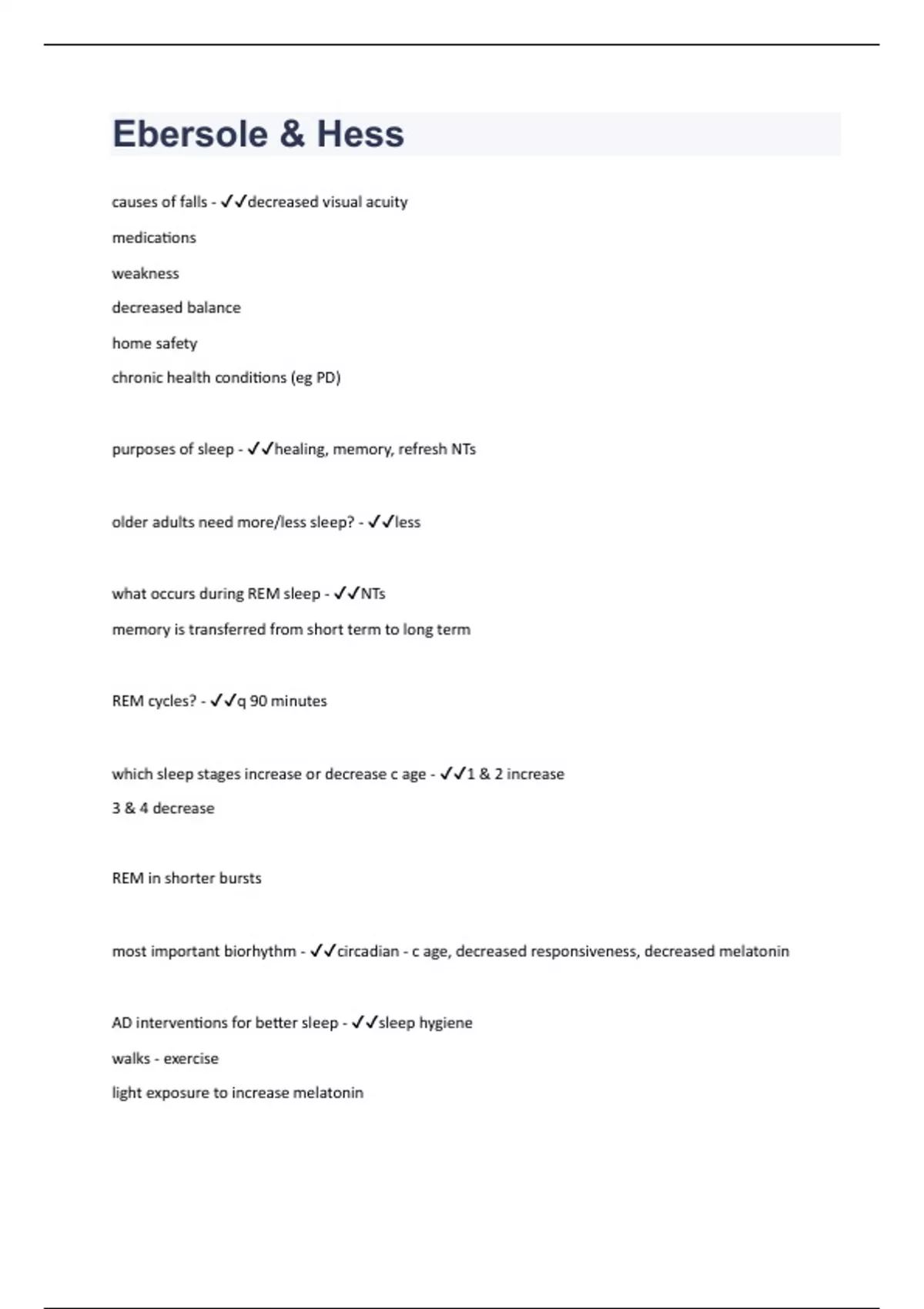 causes of falls - decreased visual acuity medications weakness decreased balance home safety chronic health conditions (eg PD) purposes of sleep - healing, memory, refresh NTs older adults need more/less sleep? - less what occurs during REM sleep - NTs memory is transferred from short term to long term REM cycles? - q 90 minutes which sleep stages increase or decrease c age - 1 & 2 increase 3 & 4 decrease REM in shorter bursts most important biorhythm - circadian - c age, decreased responsiveness, decreased melatonin AD interventions for better sleep - sleep hygiene walks - exercise light exposure to increase melatonin