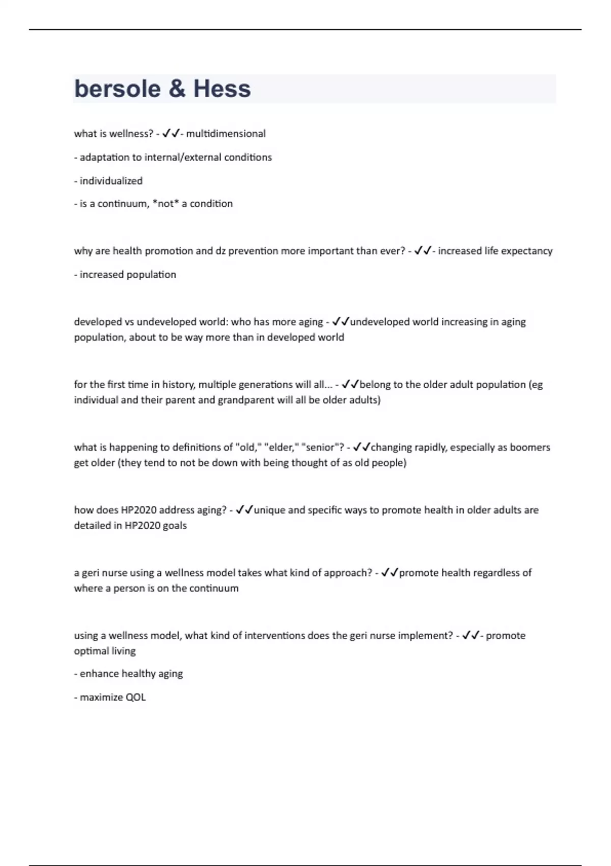 what is wellness? - - multidimensional - adaptation to internal/external conditions - individualized - is a continuum, *not* a condition why are health promotion and dz prevention more important than ever? - - increased life expectancy - increased population developed vs undeveloped world: who has more aging - undeveloped world increasing in aging population, about to be way more than in developed world for the first time in history, multiple generations will all... - belong to the older adult population (eg individual and their parent and grandparent will all be older adults) what is happening to definitions of "old," "elder," "senior"? - changing rapidly, especially as boomers get older (they tend to not be down with being thought of as old people) how does HP2020 address aging? - unique and specific ways to promote health in older adults are detailed in HP2020 goals a geri nurse using a wellness model takes what kind of approach? - promote health regardless of where a person is on the continuum using a wellness model, what kind of interventions does the geri nurse implement? - - promote optimal living - enhance healthy aging - maximize QOL