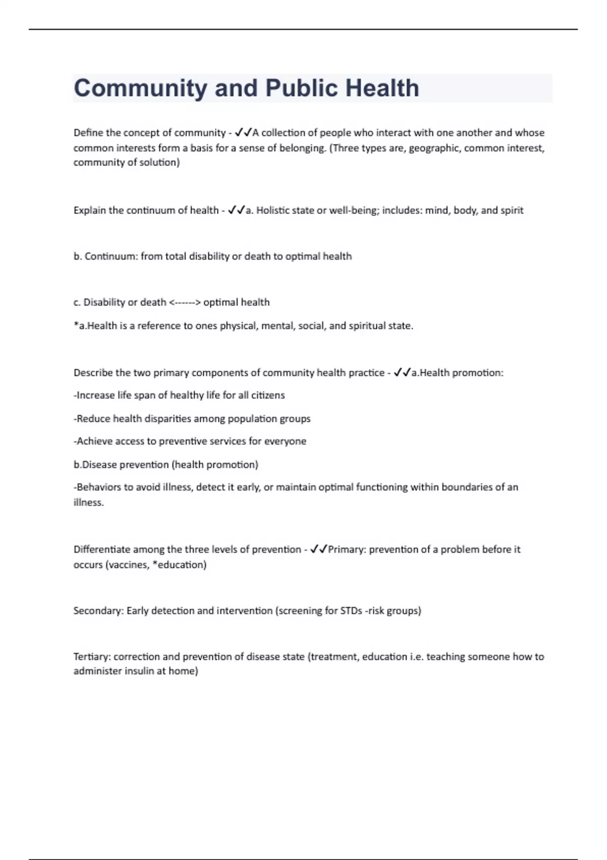 Define the concept of community - A collection of people who interact with one another and whose common interests form a basis for a sense of belonging. (Three types are, geographic, common interest, community of solution) Explain the continuum of health - a. Holistic state or well-being; includes: mind, body, and spirit b. Continuum: from total disability or death to optimal health c. Disability or death ------ optimal health *a.Health is a reference to ones physical, mental, social, and spiritual state. Describe the two primary components of community health practice - a.Health promotion: -Increase life span of healthy life for all citizens -Reduce health disparities among population groups -Achieve access to preventive services for everyone b.Disease prevention (health promotion) -Behaviors to avoid illness, detect it early, or maintain optimal functioning within boundaries of an illness. Differentiate among the three levels of prevention - Primary: prevention of a problem before it occurs (vaccines, *education) Secondary: Early detection and intervention (screening for STDs -risk groups) Tertiary: correction and prevention of disease state (treatment, education i.e. teaching someone how to administer insulin at home)