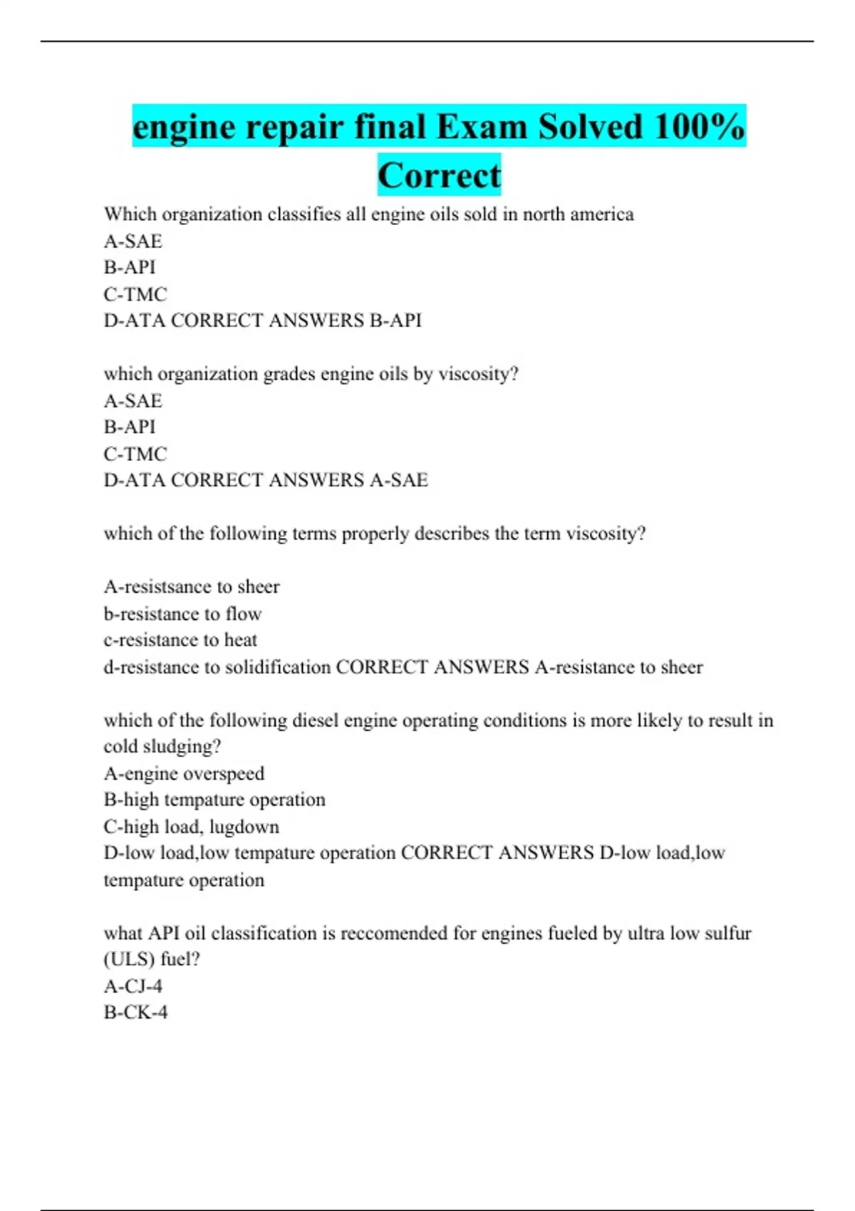 engine repair final exam solved 100 correct