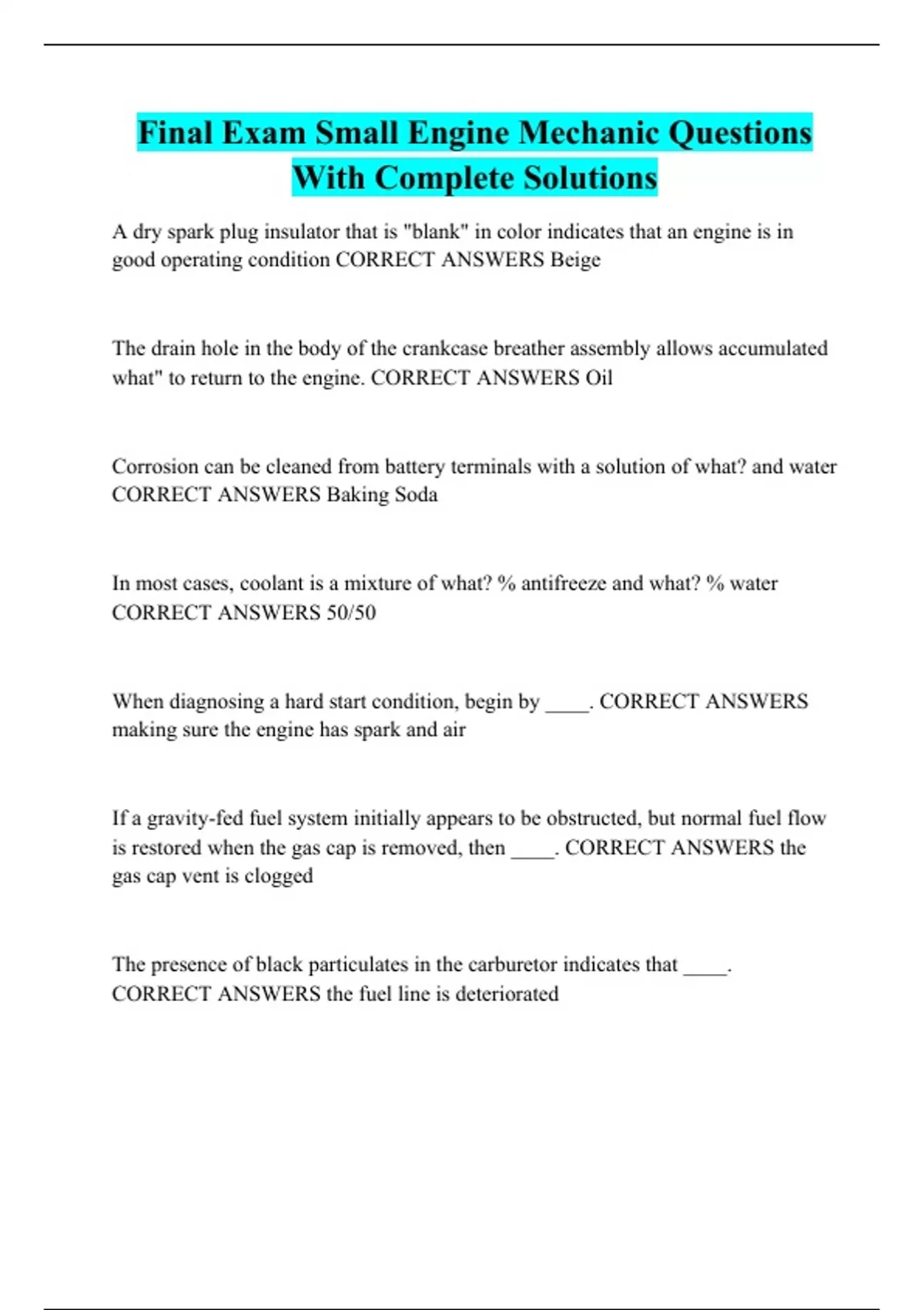 Final Exam Small Engine Mechanic Questions With Complete Solutions