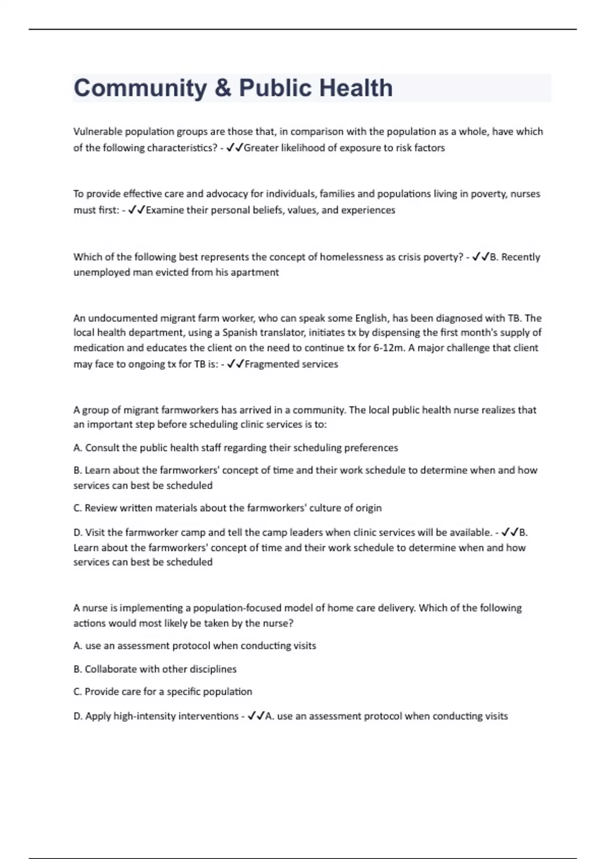 Vulnerable population groups are those that, in comparison with the population as a whole, have which of the following characteristics? - Greater likelihood of exposure to risk factors To provide effective care and advocacy for individuals, families and populations living in poverty, nurses must first: - Examine their personal beliefs, values, and experiences Which of the following best represents the concept of homelessness as crisis poverty? - B. Recently unemployed man evicted from his apartment An undocumented migrant farm worker, who can speak some English, has been diagnosed with TB. The local health department, using a Spanish translator, initiates tx by dispensing the first month's supply of medication and educates the client on the need to continue tx for 6-12m. A major challenge that client may face to ongoing tx for TB is: - Fragmented services A group of migrant farmworkers has arrived in a community. The local public health nurse realizes that an important step before scheduling clinic services is to: A. Consult the public health staff regarding their scheduling preferences B. Learn about the farmworkers' concept of time and their work schedule to determine when and how services can best be scheduled C. Review written materials about the farmworkers' culture of origin D. Visit the farmworker camp and tell the camp leaders when clinic services will be available. - B. Learn about the farmworkers' concept of time and their work schedule to determine when and how services can best be scheduled A nurse is implementing a population-focused model of home care delivery. Which of the following actions would most likely be taken by the nurse? A. use an assessment protocol when conducting visits B. Collaborate with other disciplines C. Provide care for a specific population D. Apply high-intensity interventions - A. use an assessment protocol when conducting visits