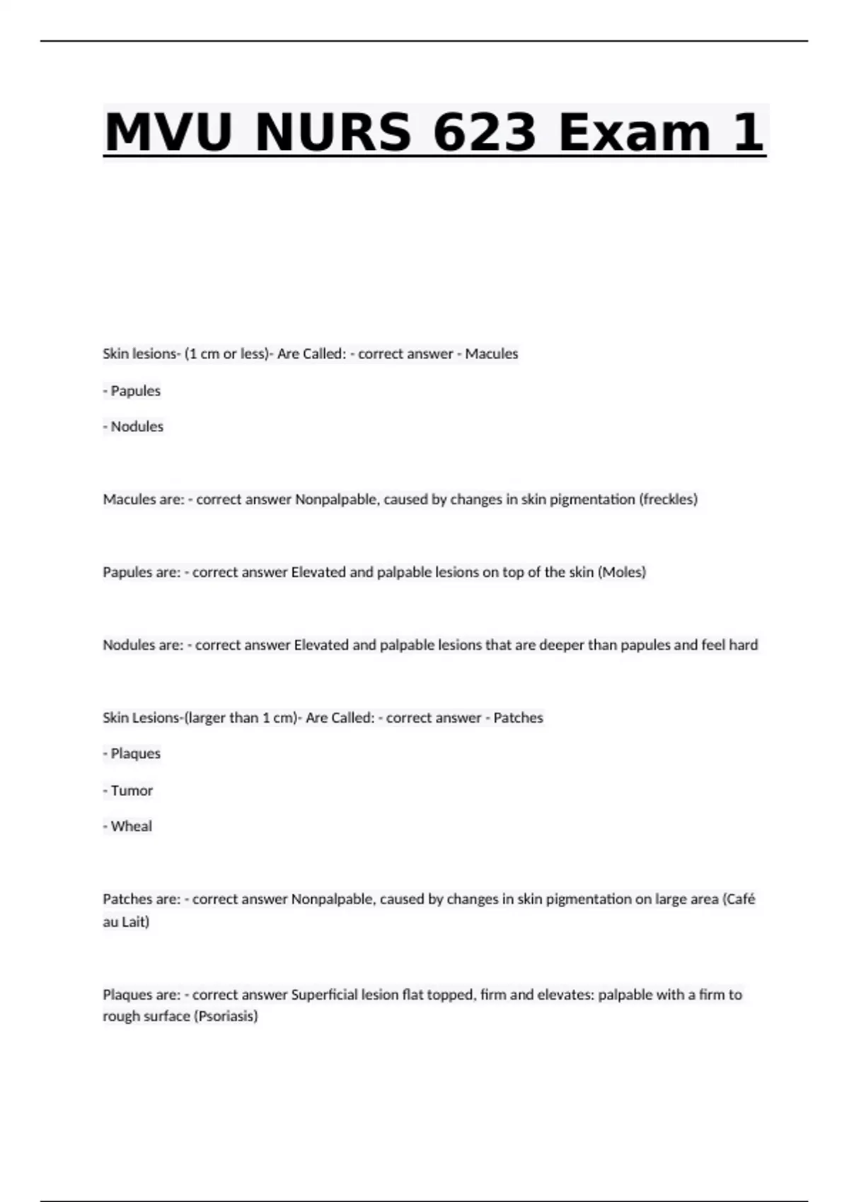 MVU NURS 623 Exam 1 Skin lesions- (1 cm or less)- Are Called: - correct answer - Macules - Papules - Nodules Macules are: - correct answer Nonpalpable, caused by changes in skin pigmentation (freckles) Papules are: - correct answer Elevated and palpable lesions on top of the skin (Moles) Nodules are: - correct answer Elevated and palpable lesions that are deeper than papules and feel hard Skin Lesions-(larger than 1 cm)- Are Called: - correct answer - Patches - Plaques - Tumor - Wheal Patches are: - correct answer Nonpalpable, caused by changes in skin pigmentation on large area (Café au Lait) Plaques are: - correct answer Superficial lesion flat topped, firm and elevates: palpable with a firm to rough surface (Psoriasis) Tumor's are: - correct answer Elevated solid mass with a hart texture; shape and borders can be irregular or regular; benign or cancerous. (Neoplasms) Wheal's are: - correct answer Transient elevated wheal (hive like) pink to red from edema and inflammation. (urticaria) Fluid Filled skin lesions are: - correct answer - Vesicle - Bulla - Pustule - Cyst Vesicles are: - correct answer An elevated lesion with distinct borders, filled with serous fluid (hsv) Bulla are: - correct answer A vesicle greater than 1 cm in diameter (blister)