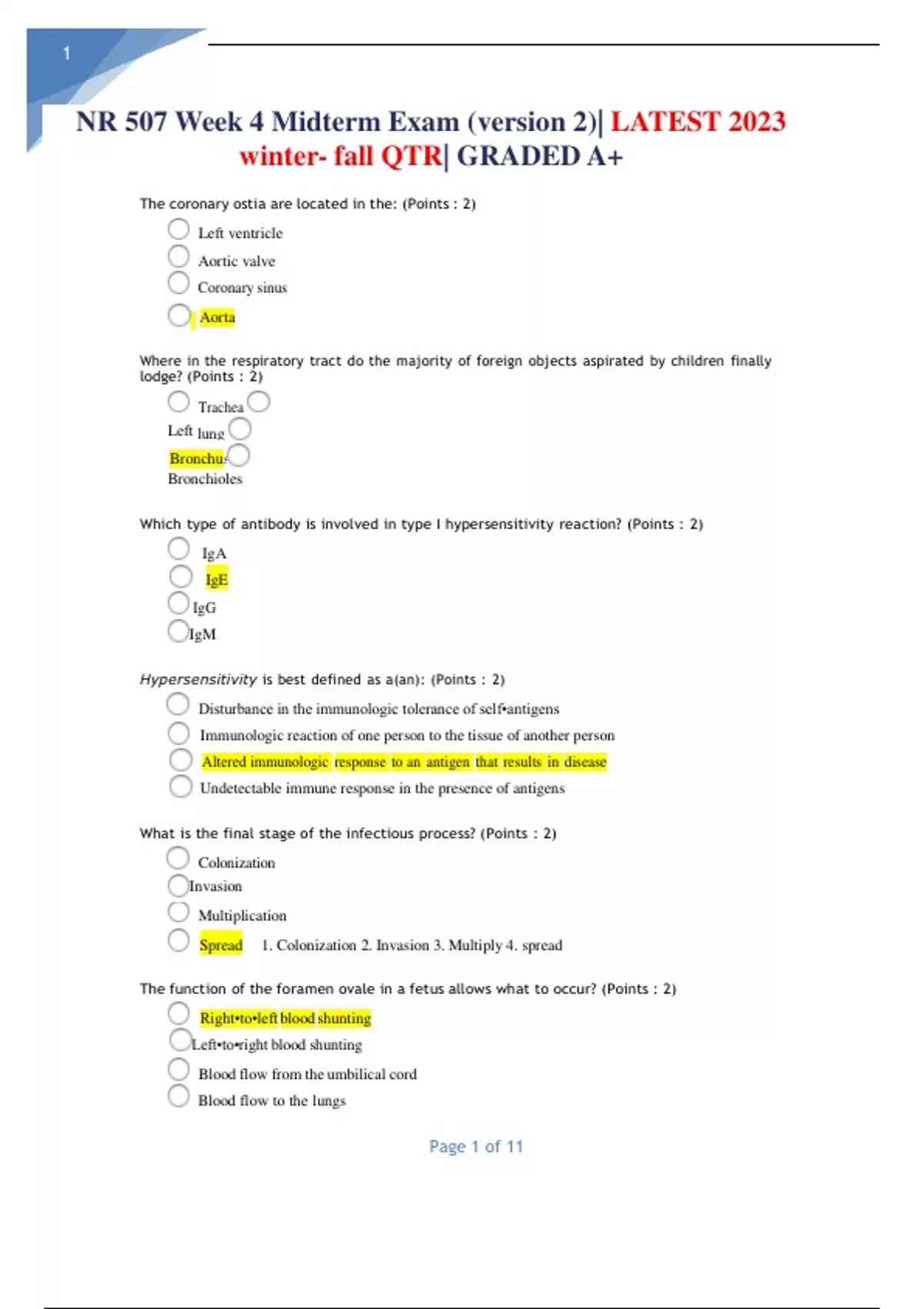 NR 507 Week 4 Midterm Exam (version 2)| LATEST 2023 winter- fall QTR| GRADED A+ The coronary ostia are located in the: (Points : 2) Left ventricle Aortic valve Coronary sinus Aorta Where in the respiratory tract do the majority of foreign objects aspirated by children finally lodge? (Points : 2) Left iBronchu Bronchioles Which type of antibody is involved in type I hypersensitivity reaction? (Points : 2) IgA iIgE IgG IgM