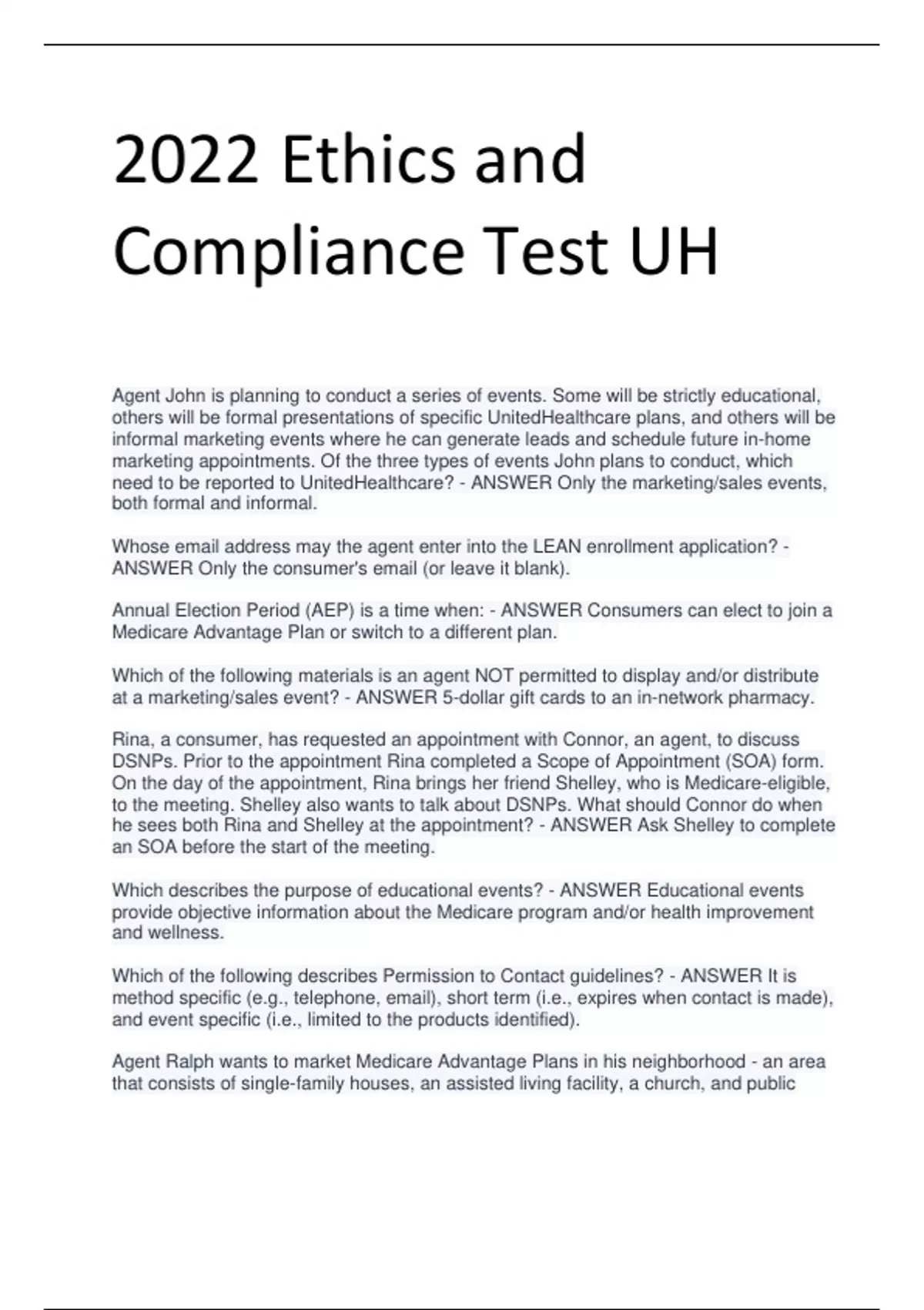 Agent John is planning to conduct a series of events. Some will be strictly educational, others will be formal presentations of specific UnitedHealthcare plans, and others will be informal marketing events where he can generate leads and schedule future in-home marketing appointments. Of the three types of events John plans to conduct, which need to be reported to UnitedHealthcare? - ANSWER Only the marketing/sales events, both formal and informal. Whose email address may the agent enter into the LEAN enrollment application? - ANSWER Only the consumer's email (or leave it blank). Annual Election Period (AEP) is a time when: - ANSWER Consumers can elect to join a Medicare Advantage Plan or switch to a different plan. Which of the following materials is an agent NOT permitted to display and/or distribute at a marketing/sales event? - ANSWER 5-dollar gift cards to an in-network pharmacy. Rina, a consumer, has requested an appointment with Connor, an agent, to discuss DSNPs. Prior to the appointment Rina completed a Scope of Appointment (SOA) form. On the day of the appointment, Rina brings her friend Shelley, who is Medicare-eligible, to the meeting. Shelley also wants to talk about DSNPs. What should Connor do when he sees both Rina and Shelley at the appointment? - ANSWER Ask Shelley to complete an SOA before the start of the meeting. Which describes the purpose of educational events? - ANSWER Educational events provide objective information about the Medicare program and/or health improvement and wellness. Which of the following describes Permission to Contact guidelines? - ANSWER It is method specific (e.g., telephone, email), short term (i.e., expires when contact is made), and event specific (i.e., limited to the products identified). Agent Ralph wants to market Medicare Advantage Plans in his neighborhood - an area that consists of single-family houses, an assisted living facility, a church, and public