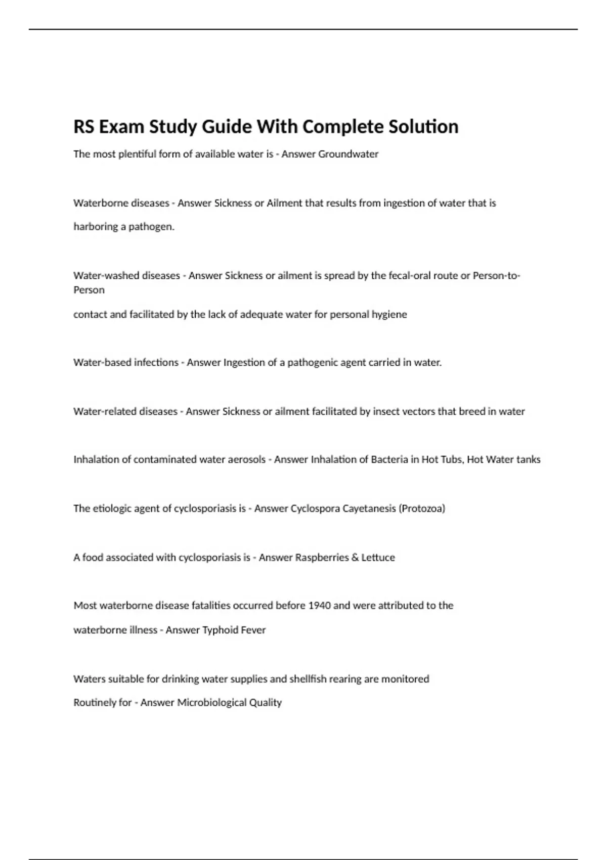 The most plentiful form of available water is - Answer Groundwater Waterborne diseases - Answer Sickness or Ailment that results from ingestion of water that is harboring a pathogen. Water-washed diseases - Answer Sickness or ailment is spread by the fecal-oral route or Person-to-Person contact and facilitated by the lack of adequate water for personal hygiene Water-based infections - Answer Ingestion of a pathogenic agent carried in water. Water-related diseases - Answer Sickness or ailment facilitated by insect vectors that breed in water Inhalation of contaminated water aerosols - Answer Inhalation of Bacteria in Hot Tubs, Hot Water tanks The etiologic agent of cyclosporiasis is - Answer Cyclospora Cayetanesis (Protozoa) A food associated with cyclosporiasis is - Answer Raspberries & Lettuce Most waterborne disease fatalities occurred before 1940 and were attributed to the waterborne illness - Answer Typhoid Fever Waters suitable for drinking water supplies and shellfish rearing are monitored Routinely for - Answer Microbiological Quality Only___________of the global content of water constitutes fresh water - Answer 2.6% A waterborne disease that can be prevented through vaccinations is - Answer poliomyelitis The World Health Organization (WHO) estimates that__________of all diseases are attributable to inadequate water or sanitation - Answer 80% Viral infections readily spread through drinking water, food and water-contact recreation activities due to: - Answer The low infectious dose of viral and protozoan pathogens What is Shigellosis specific agent? - Answer Shigella What is Shigellosis reservoir? - Answer Feces of carrier and infected people What are the symptoms of Shigellosis? - Answer abdominal cramps, fever, diarrhea, blood and mucus in stool What is the incubation period of Shigellosis? - Answer 1-7 days, average 4 days Botulism specific agent? - Answer Clostridium botulinum /C. parabotulinum toxin Botulism reservoir? - Answer soil, dust, fruit, veg, food, mud, fish, feces Botulism symptoms? - Answer diarrhea, vomiting/nausea Botulism incubation period? - Answer 2- 8 days , avg 12-36 hr Bacillus cereus food poisoning (Emetic Type) specific agent? - Answer Bacillus cereus Bacillus cereus food poisoning (Emetic Type) reservoir? - Answer spores in cereal, spice, veg, milk Bacillus cereus food poisoning (Emetic Type) symptoms? - Answer diarrhea, vomiting/nausea Bacillus cereus food poisoning (Emetic Type) incubation period? - Answer 1-6 hr Bacillus cereus foodborne illness (Diarrheal Type) specific agent - Answer Bacillus cereus Bacillus cereus foodborne illness (Diarrheal Type) reservoir? - Answer spores in cereal, spice, veg,milk Bacillus cereus foodborne illness (Diarrheal Type) symptoms? - Answer diarrhea, cramps, vomiting/nausea Bacillus cereus foodborne illness (Diarrheal Type) incubation period? - Answer 6-16 hrs Typhoid Fever specific agent? - Answer Typhoid bacillus Typhoid Fever reservoir? - Answer Feces/urine of typhoid carrier/patient Typhoid Fever symptoms? - Answer Flu-like, fever, rose spots, diarrhea Typhoid Fever incubation period? - Answer 14 days, avg 7-21 days Campylobacter enteritis specific agent? - Answer Campylobacter Campylobacter enteritis reservoir? - Answer chicken, swine, dogs, cats, man, raw milk Campylobacter enteritis symptoms? - Answer watery diarrhea, abdominal pain, fever, chills Campylobacter enteritis incubation period? - Answer 1-10 days, avg 2-5 days Amebiasis specific agent? - Answer Entamobea histolytica Amebiasis reservoir? - Answer bowel discharges of carrier of infected person Amebiasis symptoms? - Answer loss of appetite, abdominal discomfort, blood, mucus Amebiasis incubation period? - Answer 5 days or longer, avg 2-4 weeks Staphylococcus food poisoning specific agent? - Answer Staphylococci Staphylococcus food poisoning reservoir? - Answer skin, mucus, membranes, puss, dust Staphylococcus food poisoning symptoms? - Answer acute nausea, vomiting, nausea Staphylococcus food poisoning incubation period? - Answer 1-6 hr, avg 2-4 hrs Cholera specific agent? - Answer Vibrio cholerae Cholera reservoir? - Answer feces, vomitus, carriers Cholera symptoms? - Answer diarrhea, rice water stools, vomiting, thirst, pain, coma Cholera incubation period? - Answer 1 hr - 5 days, avg 3 days Yersiniosis specific agent? - Answer Yersina entercolitica Yersiniosis reservoir? - Answer wild and domestic animals, birds, man, surface water Yersiniosis symptoms? - Answer diarrhea, cramps, fever, headache, vomiting, rash Yersiniosis incubation period? - Answer 3-7 days, avg 2-3 days Trichinosis specific agent? - Answer Trichinella spiralis Trichinosis reservoir? - Answer pigs, bears, boars, rats, foxes, wolves Trichinosis symptoms? - Answer nausea, vomiting, diarrhea, muscle pain, swelling of face/eyes Trichinosis incubation period? - Answer 2-28 days , avg 9 days Cryptospordiosis specific agent? - Answer Cryptosporidium spp. Cryptospordiosis reservoir? - Answer farm animals, man, fowl, cat Cryptospordiosis symptoms? - Answer flu-like, diarrhea, vomiting, nausea Cryptospordiosis incubation period? - Answer 2-21 days, avg 2-10 days Clostridium perfringins food poisoning specific agent? - Answer Clostridium perfringens Clostridium perfringins food poisoning reservoir? - Answer soil, GI tract Clostridium perfringins food poisoning symptoms? - Answer sudden abdominal pain then diarrhea/nausea Clostridium perfringins food poisoning incubation period? - Answer 8-22 hrs, avg 10-12 hr Giardiasis specific agent? - Answer Giardia lamblia Giardiasis symptoms? - Answer prolonged diarrhea, abdominal cramps, severe weightloss Giardiasis incubation period? - Answer 6-22 days, avg 9 days Listeriosis specific agent? - Answer Listeria monocytogenes Listeriosis reservoir? - Answer goats, cattle, man, fowl, soil, water, sewage Listeriosis incubation period? - Answer 2 days to 3 weeks Scombroid fish poisoning specific agent? - Answer scombrotoxin Scombroid fish poisoning reservoir