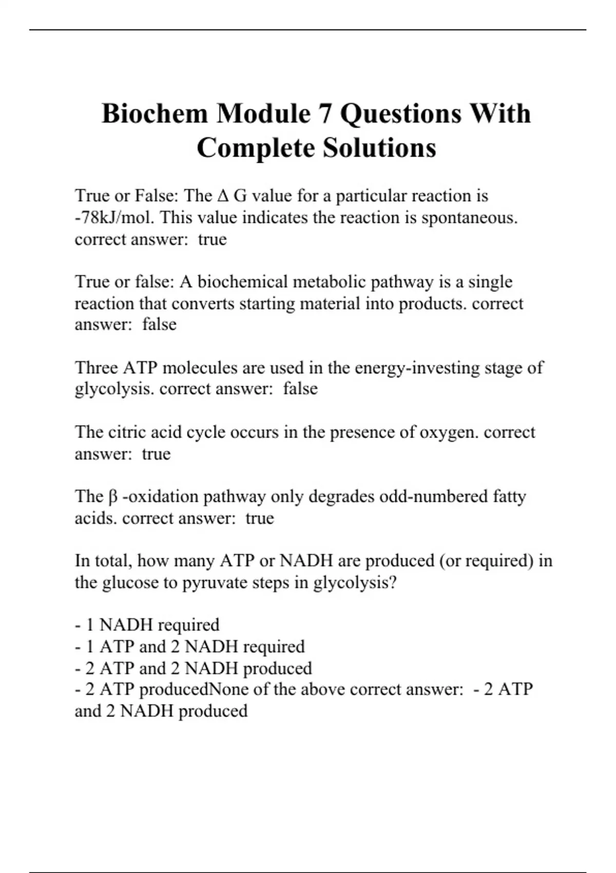 True or False: The Δ G value for a particular reaction is -78kJ/mol. This value indicates the reaction is spontaneous. correct answer: true True or false: A biochemical metabolic pathway is a single reaction that converts starting material into products. correct answer: false Three ATP molecules are used in the energy-investing stage of glycolysis. correct answer: false The citric acid cycle occurs in the presence of oxygen. correct answer: true The β -oxidation pathway only degrades odd-numbered fatty acids. correct answer: true In total, how many ATP or NADH are produced (or required) in the glucose to pyruvate steps in glycolysis? - 1 NADH required - 1 ATP and 2 NADH required - 2 ATP and 2 NADH produced - 2 ATP producedNone of the above correct answer: - 2 ATP and 2 NADH produced In converting glucose to pyruvate, how many ATP or NADH are produced (or required) in the fructose-6-phosphate to fructose-1,6-phosphate step in glycolysis? - 1 ATP required - 1 ATP produced - 2 ATP produced