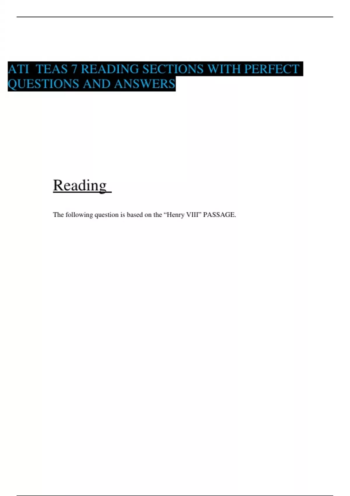 ATI TEAS 7 READING SECTIONS WITH PERFECT QUESTIONS AND ANSWERS Reading The following question is based on the “Henry VIII” PASSAGE. 1.In which of the following sources in this passage most likely to appear? (choose from the following options) 1. Autobiography 2. Newspaper 3. Bibliography 4. Encyclopedia 2. Which of the following words most closely matches the meaning of the word “in famous” as used in the passage? (choose from the following option) 1. Ethnical 2. Notorious 3. Respected 4. Temperamental 3. Which of the following is the purpose of the passage? (choose from the following option) 1. To inform 2. To persuade 3. To analyze 4. To entertain The following question is based on the “UFO Watcher” PASSAGE. 4. The reader can infer that the army does not want people to know about the U
