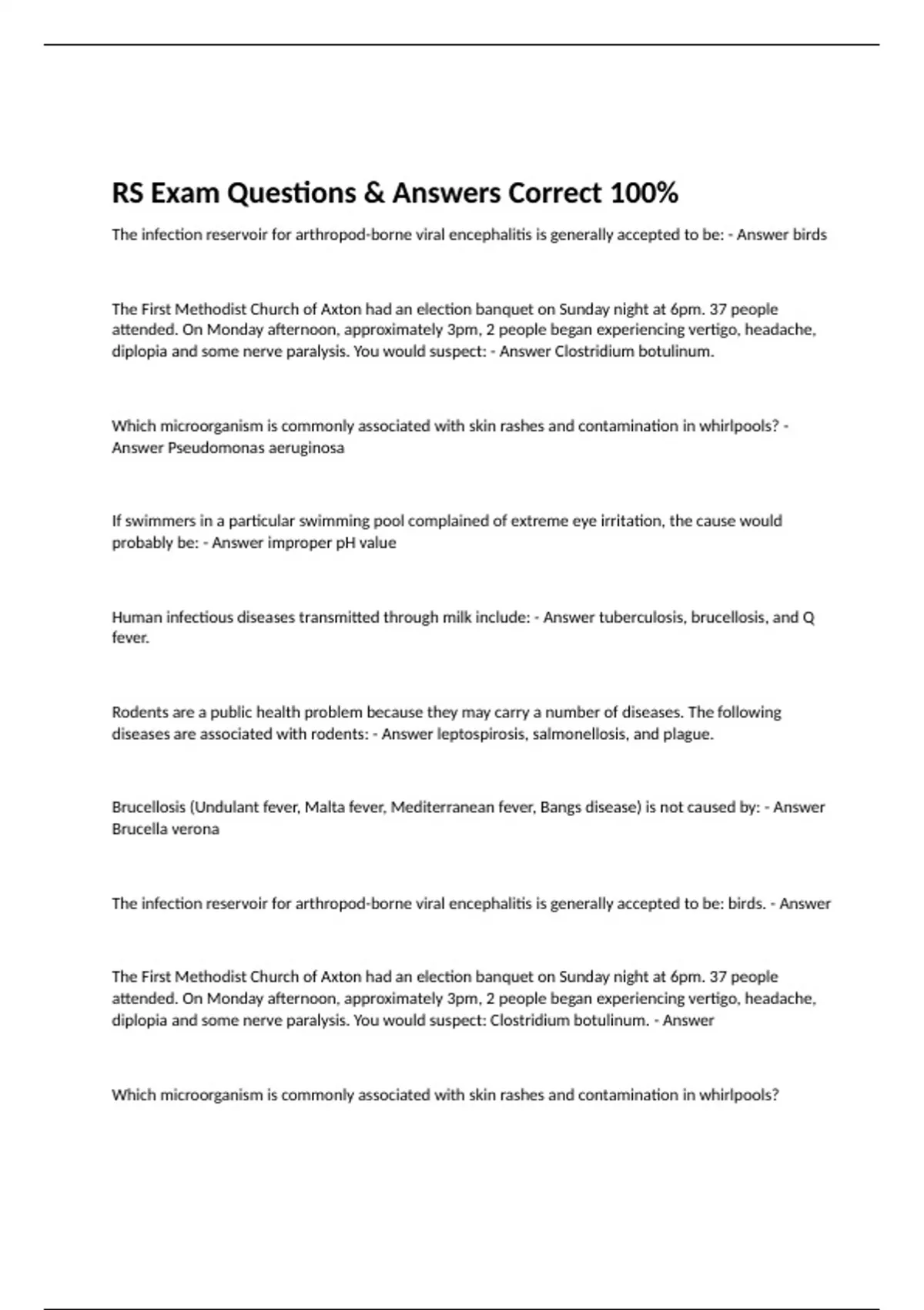 The infection reservoir for arthropod-borne viral encephalitis is generally accepted to be: - Answer birds The First Methodist Church of Axton had an election banquet on Sunday night at 6pm. 37 people attended. On Monday afternoon, approximately 3pm, 2 people began experiencing vertigo, headache, diplopia and some nerve paralysis. You would suspect: - Answer Clostridium botulinum. Which microorganism is commonly associated with skin rashes and contamination in whirlpools? - Answer Pseudomonas aeruginosa If swimmers in a particular swimming pool complained of extreme eye irritation, the cause would probably be: - Answer improper pH value Human infectious diseases transmitted through milk include: - Answer tuberculosis, brucellosis, and Q fever. Rodents are a public health problem because they may carry a number of diseases. The following diseases are associated with rodents: - Answer leptospirosis, salmonellosis, and plague. Brucellosis (Undulant fever, Malta fever, Mediterranean fever, Bangs disease) is not caused by: - Answer Brucella verona The infection reservoir for arthropod-borne viral encephalitis is generally accepted to be: birds. - Answer The First Methodist Church of Axton had an election banquet on Sunday night at 6pm. 37 people attended. On Monday afternoon, approximately 3pm, 2 people began experiencing vertigo, headache, diplopia and some nerve paralysis. You would suspect: Clostridium botulinum. - Answer Which microorganism is commonly associated with skin rashes and contamination in whirlpools? Pseudomonas aeruginosaIf swimmers in a particular swimming pool complained of extreme eye irritation, the cause would probably be: improper pH value - Answer 5. - Answer Human infectious diseases transmitted through milk include: tuberculosis, brucellosis, and Q fever. 6. - Answer Rodents are a public health problem because they may carry a number of diseases. The following diseases are associated with rodents: leptospirosis, salmonellosis, and plague. 7. - Answer Brucellosis (Undulant fever, Malta fever, Mediterranean fever, Bangs disease) of caused by: Brucella abortus, Brucella melitensis, Brucella suis 8. - Answer Refuse collection frequency depends largely on the length of time required for fly eggs to mature through the larval stages into adults. Under optimum summer temperatures, maturation time is 7 to 10 days. 9. - Answer Which of the clinical forms of plague are the least fatal? Bubonic, lymphatic involvement 10. - Answer Which of the following statements is true of radiation? Damage to cells by radiation is repairable. 11. - Answer The ionizing of electromagnetic radiation forms may be found at: greater than 1016 Hz. 12. - Answer Which of the following is not one of the common deficiencies found in hospital radiography? Useful beam and scatter radiation passing through window and into occupied regions nearby. 13. - Answer In producing a noise-induced permanent threshold shift, ________ is the least important factor involved. The work shift of the employee 14. - Answer Which of the following effects best characterizes the influence of ozone on humans? A thickening of small pulmonary arteries is induced, leading to chronic pulmonary disease, emphysema, and right heart failure. 15. - Answer A controversial hormone is used in animal feed to hasten fattening of meat producing animals. The name of this hormone is: diethylstilbesterol 16. - Answer After eating at a nearby restaurant, a person complains of burning sensations in the neck and abdomen and pressure over the face and chest. What is the best indication of the cause of illness? Chemical additives used in the food 17. - Answer What toxic substance found in well water is based on maximum concentration and annual, average, daily air temperature? Fluoride 18. - Answer Which of the following groups would you expect to exhibit the highest incidence of Echinococcus granulosus infection? Shepherds in the Southwest 19. - Answer A fume is best described as: metal oxides (solid particles) 20. - Answer Workers in dental offices may receive significant exposures to what systemic poison? Mercury vapor 21. - Answer The effects of exposure to radiation are: accumulative 22. - Answer The table below summarizes food history attack rates from a foodborne outbreak. What is the attack rate (%) for Group A for those eating barbeque sauce? Barbeque sauce: persons positive 59 persons not positive 12 total persons 71, the attack rate is 83.1% 23. - Answer From the preceding table, identify the food that is most suspect? Barbeque sauce 24. - Answer Average date of onset? 25. - Answer If other epidemiologic and diagnostic data leads you to suspect typhoid fever as the etiologic agent, what day would be the average day of exposure? 11th 26. - Answer Case histories of serious toxic chemical contamination are becoming increasingly common. Which are properly matched : Kepone-1975 Virginia; PBB-1976 Michigan; Carbon tetrachloride-Love Canal NY. Which is not properly matched? Methyl lead-Minimata Bay Japan 27. - Answer Which of the following groups would be likely to have the highest incidence of hookworm infestation? Sharecroppers in Alabama 28. - Answer Most accidents around swimming pools involve: cuts and abrasions 29. - Answer Which of the following types of development contributes to urban sprawl and overextends public utilities? Leapfrog development 30. - Answer The bacterial contamination of oysters and shellfish is increasing due to what primary factor? An increase in dumping of municipal wastewater into coastal waters. 31. - Answer Which of the following is not an organic phosphorus insecticide? Sevin 32. - Answer Automobiles are the major emitters of: oxides of nitrogen, hydrocarbons, and carbon monoxide. 33. - Answer A nosocomial infection is: acquired after admission and diagnosed before or after discharge. 34. - Answer In most cases, the ______ have been removed from leachate from a solid waste disposal site that has filtered through so