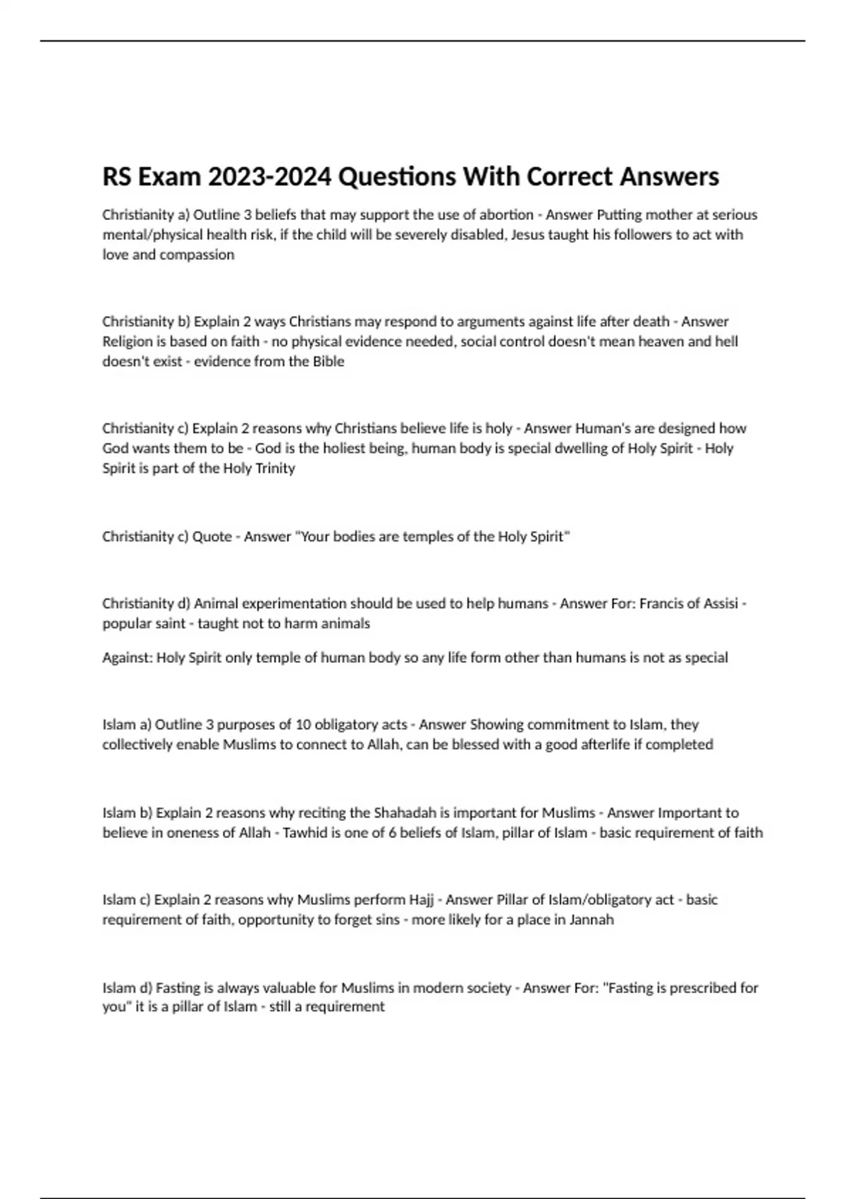 Christianity a) Outline 3 beliefs that may support the use of abortion - Answer Putting mother at serious mental/physical health risk, if the child will be severely disabled, Jesus taught his followers to act with love and compassion Christianity b) Explain 2 ways Christians may respond to arguments against life after death - Answer Religion is based on faith - no physical evidence needed, social control doesn't mean heaven and hell doesn't exist - evidence from the Bible Christianity c) Explain 2 reasons why Christians believe life is holy - Answer Human's are designed how God wants them to be - God is the holiest being, human body is special dwelling of Holy Spirit - Holy Spirit is part of the Holy Trinity Christianity c) Quote - Answer "Your bodies are temples of the Holy Spirit"