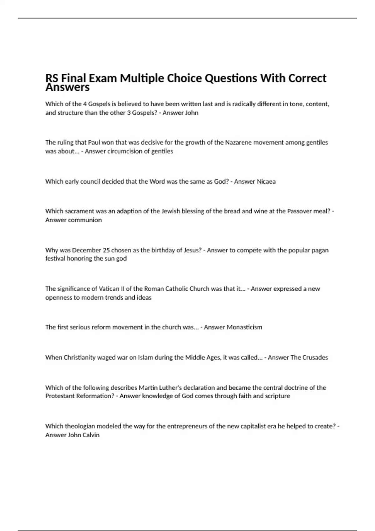 Which of the 4 Gospels is believed to have been written last and is radically different in tone, content, and structure than the other 3 Gospels? - Answer John The ruling that Paul won that was decisive for the growth of the Nazarene movement among gentiles was about... - Answer circumcision of gentiles Which early council decided that the Word was the same as God? - Answer Nicaea Which sacrament was an adaption of the Jewish blessing of the bread and wine at the Passover meal? - Answer communion Why was December 25 chosen as the birthday of Jesus? - Answer to compete with the popular pagan festival honoring the sun god The significance of Vatican II of the Roman Catholic Church was that it... - Answer expressed a new openness to modern trends and ideas The first serious reform movement in the church was... - Answer Monasticism When Christianity waged war on Islam during the Middle Ages, it was called... - Answer The Crusades