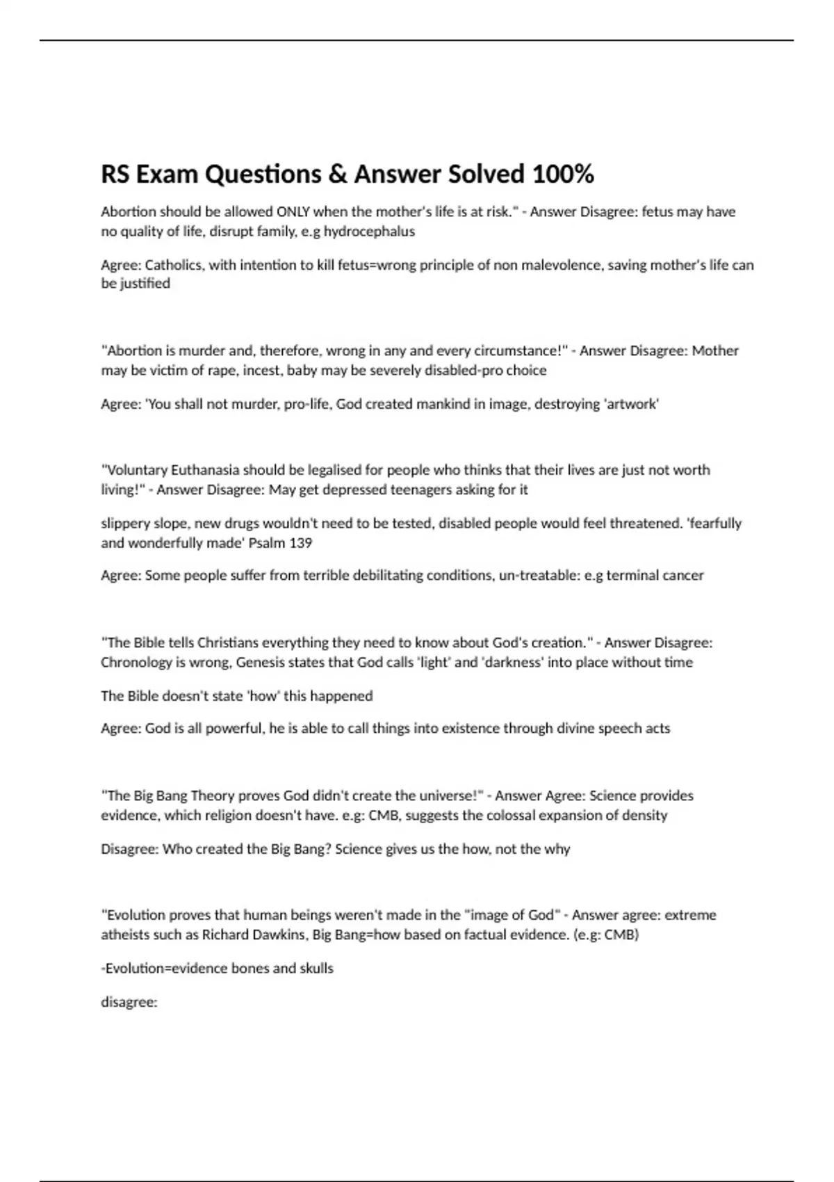 Abortion should be allowed ONLY when the mother's life is at risk." - Answer Disagree: fetus may have no quality of life, disrupt family, e.g hydrocephalus Agree: Catholics, with intention to kill fetus=wrong principle of non malevolence, saving mother's life can be justified "Abortion is murder and, therefore, wrong in any and every circumstance!" - Answer Disagree: Mother may be victim of rape, incest, baby may be severely disabled-pro choice Agree: 'You shall not murder, pro-life, God created mankind in image, destroying 'artwork' "Voluntary Euthanasia should be legalised for people who thinks that their lives are just not worth living!" - Answer Disagree: May get depressed teenagers asking for it slippery slope, new drugs wouldn't need to be tested, disabled people would feel threatened. 'fearfully and wonderfully made' Psalm 139 Agree: Some people suffer from terrible debilitating conditions, un-treatable: e.g terminal cancer "The Bible tells Christians everything they need to know about God's creation." - Answer Disagree: Chronology is wrong, Genesis states that God calls 'light' and 'darkness' into place without time The Bible doesn't state 'how' this happened Agree: God is all powerful, he is able to call things into existence through divine speech acts "The Big Bang Theory proves God didn't create the universe!" - Answer Agree: Science provides evidence, which religion doesn't have. e.g: CMB, suggests the colossal expansion of density Disagree: Who created the Big Bang? Science gives us the how, not the why "Evolution proves that human beings weren't made in the "image of God" - Answer agree: extreme atheists such as Richard Dawkins, Big Bang=how based on factual evidence. (e.g: CMB) -Evolution=evidence bones and skulls disagree: "You can be religious, you can be scientific: but you really can't be BOTH!" - Answer "Abuse of the environment is impossible to stop!" (2018) - Answer