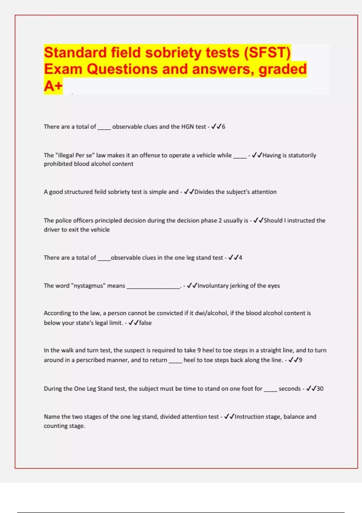 Standard field sobriety tests (SFST) Exam Questions and answers, graded A+
