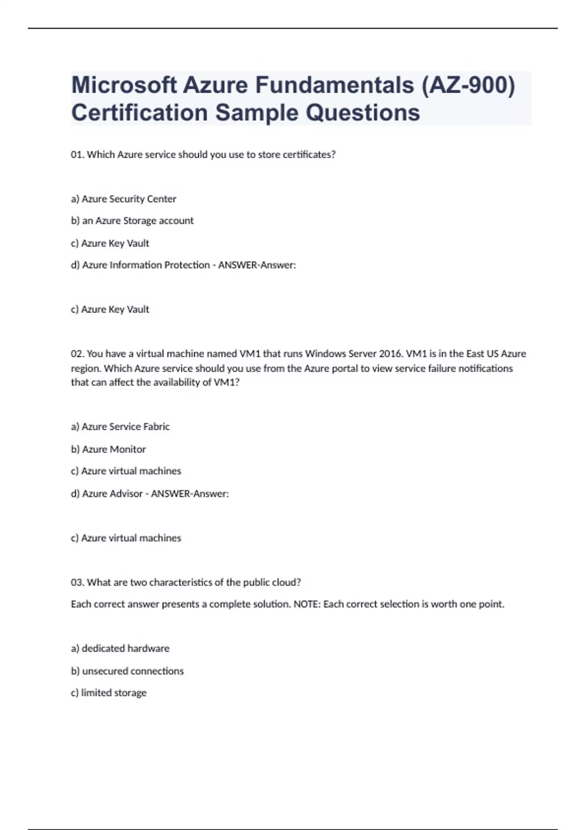 Microsoft Azure Fundamentals (AZ-900) Certification Sample Questions 01. Which Azure service should you use to store certificates? a) Azure Security Center b) an Azure Storage account c) Azure Key Vault d) Azure Information Protection - ANSWER-Answer: c) Azure Key Vault 02. You have a virtual machine named VM1 that runs Windows Server 2016. VM1 is in the East US Azure region. Which Azure service should you use from the Azure portal to view service failure notifications that can affect the availability of VM1? a) Azure Service Fabric b) Azure Monitor c) Azure virtual machines d) Azure Advisor - ANSWER-Answer: c) Azure virtual machines 03. What are two characteristics of the public cloud? Each correct answer presents a complete solution. NOTE: Each correct selection is worth one point. a) dedicated hardware b) unsecured connections c) limited storage