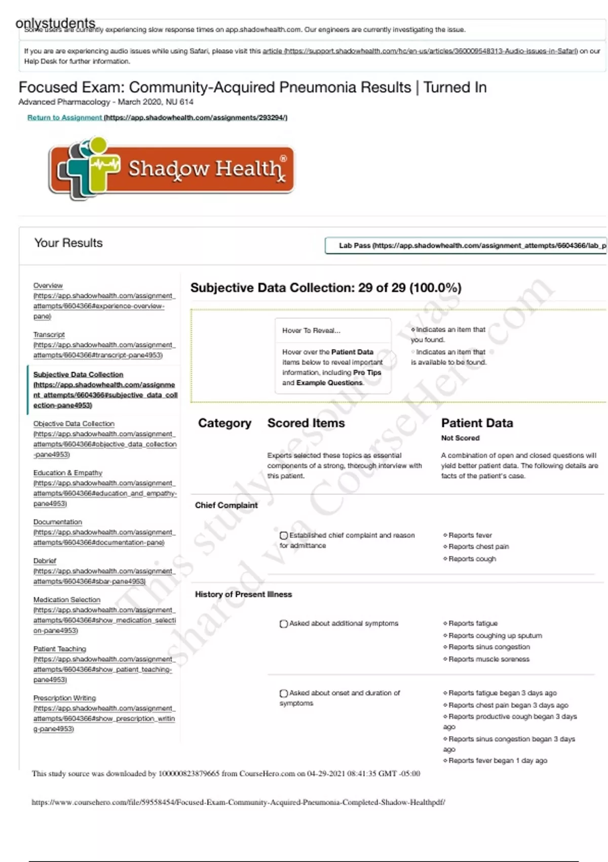 Focused Exam: Community-Acquired Pneumonia Shadow Health- Education and EmpathySome users are currently experiencing slow response times on . Our engineers are currently investigating the issue. If you are are experiencing audio issues while using Safari, please visit this article ( Help Desk for further information. Subjective Data Collection: 29 of 29 (100.0%) Chief Complaint History of Present Illness Your Results Lab Pass ( ( attempts/#experience-overviewpane) Transcript ( attempts/#transcript-pane4953) Subjective Data Collection ( nt_attempts/#subjective_data_coll ection-pane4953) Objective Data Collection ( attempts/#objective_data_collection -pane4953) Education & Empathy ( attempts/#education_and_empathypane4953) Documentation ( attempts/#documentation-pane) Debrief ( attempts/#sbar-pane4953) Medication Selection ( attempts/#show_medication_selecti on-pane4953) Patient Teaching ( attempts/#show_patient_teachingpane4953) Prescription Writing ( attempts/#show_prescription_writin g-pane4953) Indicates an item that you found. Indicates an item that is available to be found. Category Scored Items Experts selected these topics as essential components of a strong, thorough interview with this patient. Patient Data Not Scored A combination of open and closed questions will yield better patient data. The following details are facts of the patient's case. Established chief complaint and reason for admittance Reports fever Reports chest pain Reports cough Asked about additional symptoms Reports fatigue Reports coughing up sputum Reports sinus congestion Reports muscle soreness Asked about onset and duration of symptoms Reports fatigue began 3 days ago Reports chest pain began 3 days ago Reports productive cough began 3 days ago Reports sinus congestion began 3 days ago Reports fever began 1 day ago Hover To Reveal... Hover over the Patient Data items below to reveal important information, including Pro Tips and Example Questions. This study source was downloaded by from CourseH on :41:35 GMT -05:00 This study resource was shared via CourseH o