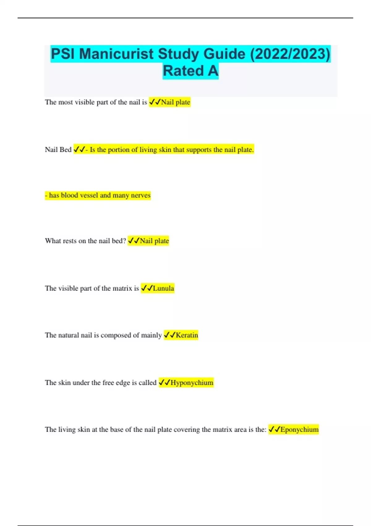 PSI Manicurist Study Guide (2022/2023) Rated A The most visible part of the nail is Nail plate Nail Bed - Is the portion of living skin that supports the nail plate. - has blood vessel and many nerves What rests on the nail bed? Nail plate The visible part of the matrix is Lunula The natural nail is composed of mainly Keratin The skin under the free edge is called Hyponychium The living skin at the base of the nail plate covering the matrix area is the: Eponychium Nail Folds - skin folds that overlap border of nail - tissue that encloses the nail matrix at the root of the nail - It attaches the nail to the rest of the skin through the protective cuticle Basic Nail Shapes - Squoval: square shaped with rounded edgers - Square Nails: square shaped straight across, no rounding edges - Rounded: tapered and extended past the fingertip - Oval: ideal shape for most women and safe (businesswomen, teachers,...etc) - Pointed: suited for thin hands, long fingers, narrow nail bed. This nail shape is weaker, break more easily and hard to maintain What do you use to remove tweezers from disinfectant solution? Tongs, gloves or draining basket Nippers - Instrument used for manicures and pedicures to trim dead skin around the nail. - never used to cut live, rip, or tear live tissues because it protects nail from infection - avoid using on diabetic clients due to high risk of infection Tapotement Movement lightly tap over the entire foot to complete massage Signs of a healthy nail - white, translucent in appearance with a pinkish color of the nail bed showing through - smooth and absorbs water Solon Pedicure Logbook - kept for 2 months/60 days