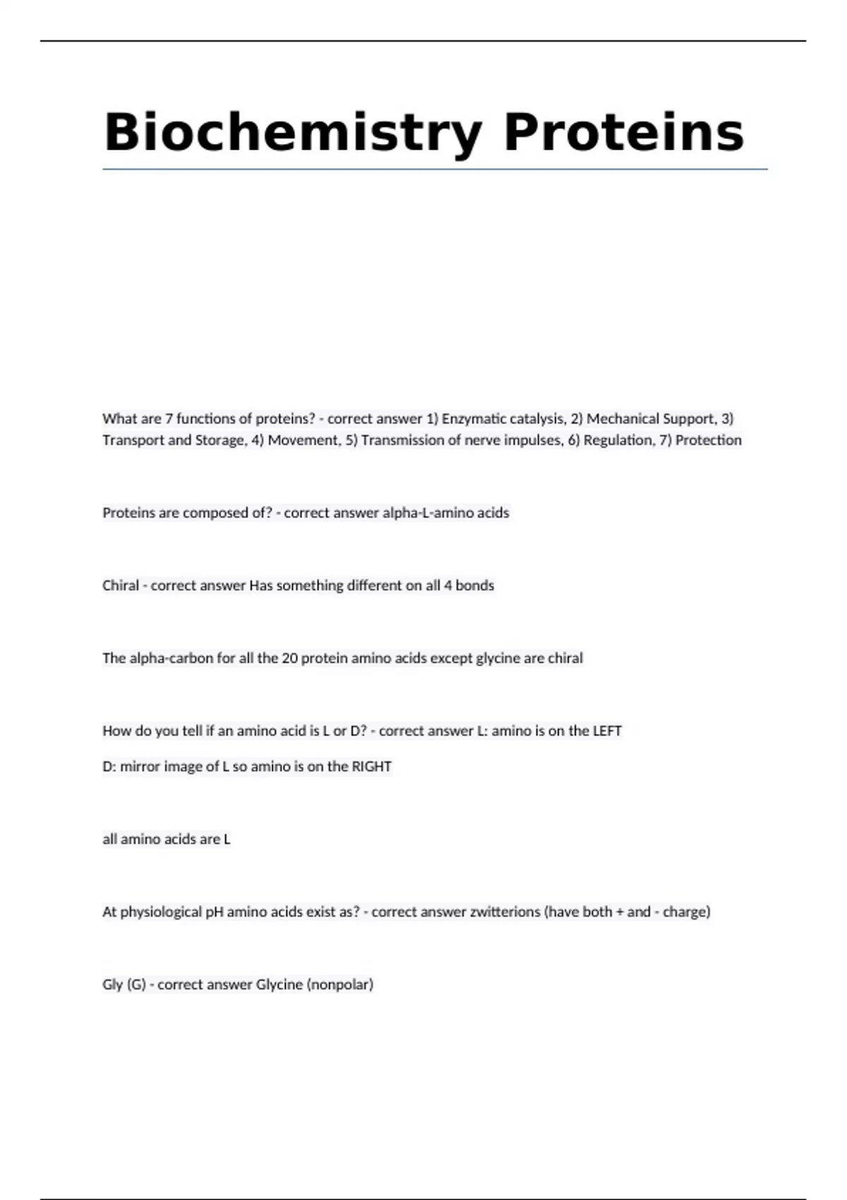 Biochemistry Proteins What are 7 functions of proteins? - correct answer 1) Enzymatic catalysis, 2) Mechanical Support, 3) Transport and Storage, 4) Movement, 5) Transmission of nerve impulses, 6) Regulation, 7) Protection Proteins are composed of? - correct answer alpha-L-amino acids Chiral - correct answer Has something different on all 4 bonds The alpha-carbon for all the 20 protein amino acids except glycine are chiral How do you tell if an amino acid is L or D? - correct answer L: amino is on the LEFT D: mirror image of L so amino is on the RIGHT all amino acids are L At physiological pH amino acids exist as? - correct answer zwitterions (have both + and - charge) Gly (G) - correct answer Glycine (nonpolar) Ala (A) - correct answer Alanine (nonpolar) Val (V) - correct answer Valine (nonpolar) Leu (L) - correct answer Leucine (nonpolar) Ile (I) - correct answer Isoleucine (nonpolar) Phe (F) - correct answer Phenylalanine (nonpolar) Trp (W) - correct answer Tryptophan (nonpolar) Met (M) - correct answer Methionine (nonpolar) Pro (P) - correct answer Proline (nonpolar) Ser (S) - correct answer Serine (uncharged polar) Cys (C) - correct answer Cysteine (uncharged polar) Thr (T) - correct answer Threonine (uncharged polar) Tyr (Y) - correct answer Tyrosine (uncharged polar) Asn (N) - correct answer Asparagine (uncharged polar) Gln (Q) - correct answer Gluatamine (uncharged polar) Asp (D) - correct answer Aspartate (negatively charged) Glu (E) - correct answer Glutamate (negatively charged) Lys (K) - correct answer Lysine (positively charged) Arg (R) - correct answer Arginine (positively charged) His (H) - correct answer Histidine (positively charged) You have to add what in order for a peptide bond to from between alpha-L-amino acids to make a protein - correct answer ATP (this reaction is not spontaneous, energy as ATP is required) A peptide bond has what type of character - correct answer A partial double bond character (rigid sticks and flexy strings-phi and psi bonds) Double bonds are rigid and planar. The C and N of the peptide bond do not rotate with respect to each other Naming peptide chains - correct answer This is used in naming....-yl is used when the amino acid no longer has a free carboxyl group... Ex. Phenyl-alanyl-glycyl-methionine (Phenylalanylglycylmethionine) Phosphorylation modification - correct answer (of side chains with free hydroxyl groups) -addition of phosphate group to amino acids that have already been in proteins -done to many proteins, which will change the proteins activity (increase or decrease) Glycosylation modification - correct answer (carbohydrate groups may be attached to protein via N or O linkages) - add carbs to proteins - done to many proteins because car groups is like a destination tag on the protein (it signals the cell to put those proteins into specific places) Hydroxylation modification - correct answer (of prolyl or lysyl residues) - done to just a few proteins, notably collagen which is a really important protein in connective tissue Carboxylation modification - correct answer (of glutamyl groups) - done to just a few proteins, notably in many proteins involved in blood clotting (Vitamin K) O-linked glycosylation - correct answer SER, TYR, THR, hydroxylysin (side chain made from lysine after lysine was incorporated into a protein-there is no free hydroxylysin) !! - Polysaccharide is actually built on the protein one monosaccharide at a time! N-linked glycosylation - correct answer ASN!! (always asparagine) !!! - The polysaccharide is made first and then added to the protein What can keep Lysyl Hydroxylase and Prolyl Hydroxylase in it's reduced forms during hydroxylation? - correct answer Vitamin C can keep these enzymes in their appropriate reduced states to keep them from being inappropriately oxidized Energy Investment required to disrupt particular interaction - correct answer 1) Disulfide bonds (a type of covalent bond) 100 kcal/mol 2) Ionic interactions (10 kcal/mol) 3) Hydrogen bonds (5 kcal/mol) 4) Hydrophobic interactions (3 kcal/mol) What are the most important type of interactions? - correct answer Hydrogen bonds and Hydrophobic interactions, although the weakest, are the most important in maintaining the native conformation. -They are most abundant types of interactions. Disulfide bridges are? - correct answer covalent bonds formed by the oxidation of cysteinyl residues. They may be intra-chain or inter-chain What is cystine? - correct answer it is the diamino acid fromed by the oxidation of two cysteines to produce a disulfide bond between them -NOT A DIPEPTIDE (there is no peptide bond) Why does association of nonpolar molecules occur? - correct answer Because a mixture of nonpolar compounds and water is most stable when the nonpolar molecules associate together (systems proceed to the most naturally stable state) -less H-bonds are disrupted if the nonpolar molecules are more compact therefor decreasing the energy and making it more stable Hydrophillic molecules also disrupt H-Bonds between water molecules, but the destabilization caused by the disruption of H20-H20 bonds is offset by what? - correct answer By the formation of H-Bonds between the hydrophillic molecule ad the water (solvent) What type of proteins exist in an oily solution under physiological conditions? - correct answer Membrane proteins What is the Primary Structure of a Protein? - correct answer The linear sequence (particular order) of amino acids in a protein What is the Secondary Structure of a Protein? - correct answer Regions of a protein often fit a particular stereotypic pattern 1)alpha-helices and beta-sheets What is the Tertiary Structure of a Protein? - correct answer The overall three dimensional folding of a protein. What is the Quarternary Structure of a Protein? - correct answer It's the spatial arrangement of more than one polypeptide subunit. What types of bonds maintain the Primary Structure of a Protein? - correct answer Covalent bonds (spe