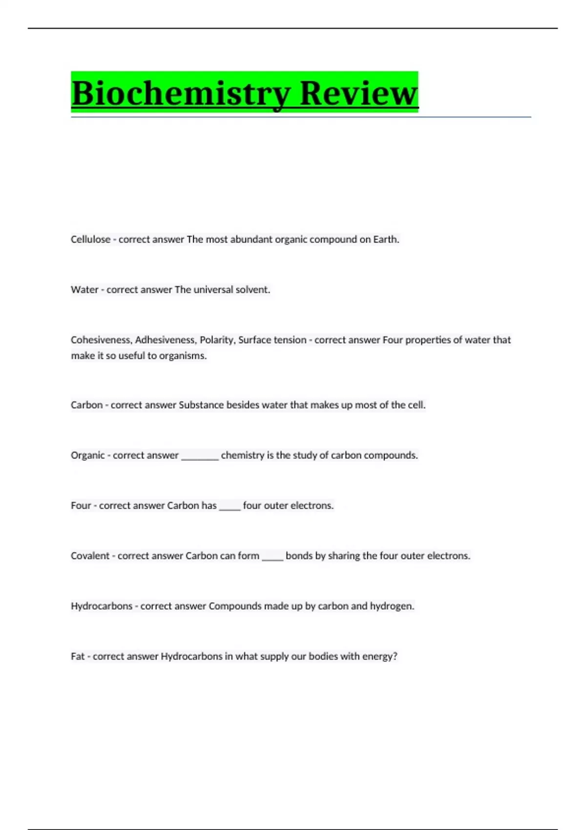 Biochemistry Review Cellulose - correct answer The most abundant organic compound on Earth. Water - correct answer The universal solvent. Cohesiveness, Adhesiveness, Polarity, Surface tension - correct answer Four properties of water that make it so useful to organisms. Carbon - correct answer Substance besides water that makes up most of the cell. Organic - correct answer _______ chemistry is the study of carbon compounds. Four - correct answer Carbon has ____ four outer electrons. Covalent - correct answer Carbon can form ____ bonds by sharing the four outer electrons. Hydrocarbons - correct answer Compounds made up by carbon and hydrogen. Fat - correct answer Hydrocarbons in what supply our bodies with energy? Shape - correct answer The ____ of an organic molecule determines its function. Functional - correct answer What groups give different properties to the organic compound to which they attach? Polymers - correct answer Large organic molecules. monomers - correct answer Polymers are built from smaller subunits called _____. Macromolecules - correct answer Biologists call polymers _____. Proteins, Lipids, Carbohydrates, Nucleic acids - correct answer Four examples of polymers found in living things. Polymers - correct answer Monomers linked together. Dehydration synthesis - correct answer The process of linking monomers together. Hydrolysis - correct answer The process used to break down large polymers into smaller monomers. Soft drinks, sports drinks, potatoes, pasta - correct answer Foods that contain lots of carbohydrates. Simple - correct answer Monosaccharides are ___ sugars. Glucose, Galactose, Fructose - correct answer Three monosaccharides. Carbons - correct answer Monosaccharides are called hexose sugars because they contain six ____. Glucose - correct answer Simple sugar made by plants. Fructose - correct answer Sugar found in fruits. Galactose - correct answer The "milk sugar". Isomer - correct answer Same formula, different structure. Isomers - correct answer Fructose and glucose are both _____. Disaccharide - correct answer Name of a double sugar. Glycosidic bond - correct answer The bond that joins disaccharides together. Disaccharides - correct answer Sucrose, lactose, and maltose are all _____. Polysaccharides - correct answer Complex carbohydrates. Monosaccharides - correct answer Chains of ______ are called polysaccharides. Polysaccharides - correct answer Starch, glycogen, and cellulose are all ______. Glycogen - correct answer Animals store their carbohydrate energy as _____. Hydrophilic - correct answer Sugars dissolve in water, they are water-loving or ______. Hydrophobic - correct answer Water fearing. Triglycerides - correct answer Monomers that make up lipids or fats. Phospholipids - correct answer What lipids are in cell membranes? Globular - correct answer Enzymes have what shape? Yes - correct answer Can enzymes be reused? Polypeptides - correct answer Protein chains are called what? Insulin - correct answer What protein controls blood sugar level? DNA and RNA - correct answer The two types of nucleic acids are what? Chemical bonds - correct answer Where is the energy stored in ATP? Phosphate bonds - correct answer Which bonds are considered high energy bonds in ATP? Adenosine diphosphate - correct answer When the last phosphate bond is broken, what is released?