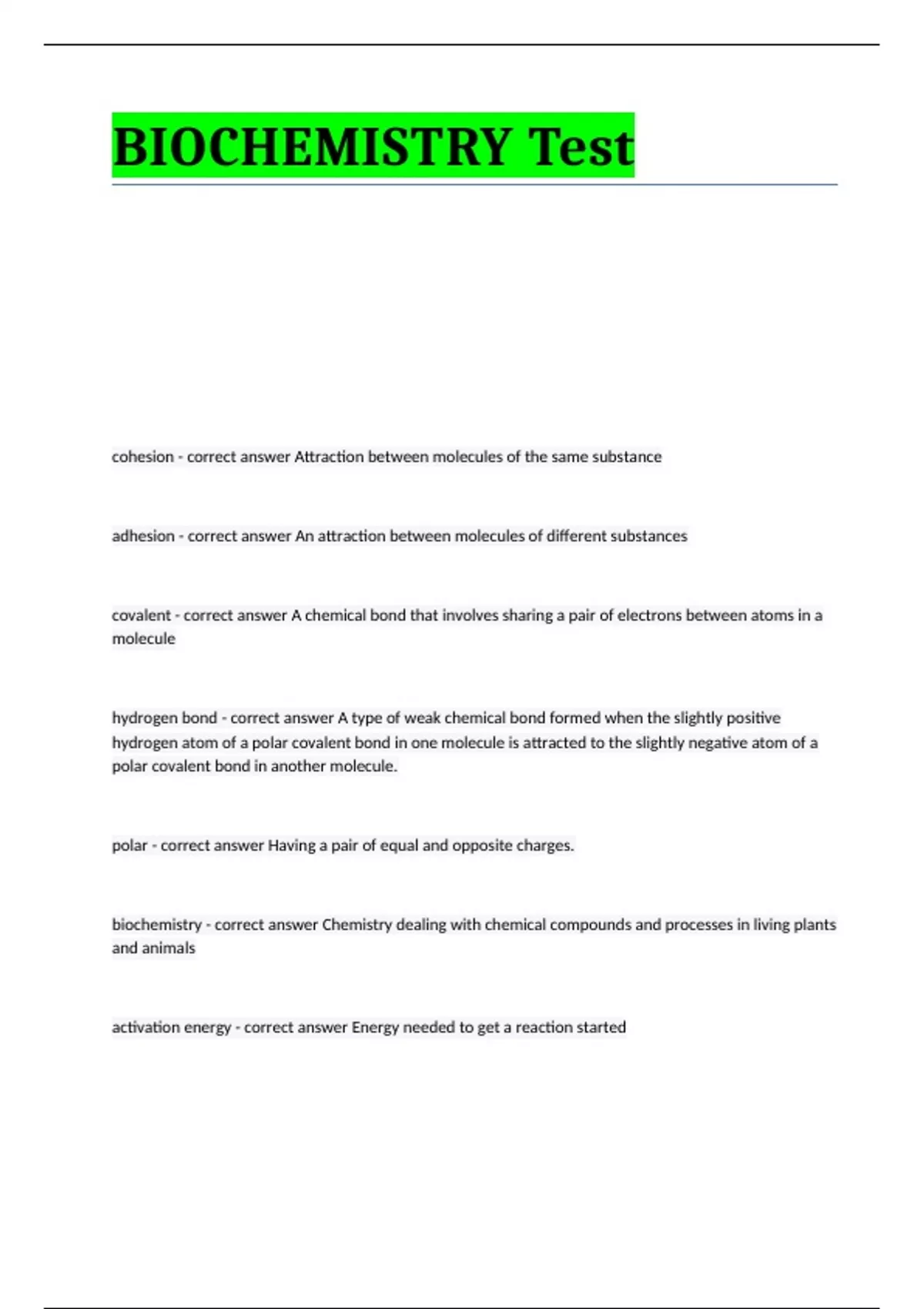 BIOCHEMISTRY Test cohesion - correct answer Attraction between molecules of the same substance adhesion - correct answer An attraction between molecules of different substances covalent - correct answer A chemical bond that involves sharing a pair of electrons between atoms in a molecule hydrogen bond - correct answer A type of weak chemical bond formed when the slightly positive hydrogen atom of a polar covalent bond in one molecule is attracted to the slightly negative atom of a polar covalent bond in another molecule. polar - correct answer Having a pair of equal and opposite charges. biochemistry - correct answer Chemistry dealing with chemical compounds and processes in living plants and animals activation energy - correct answer Energy needed to get a reaction started ph scale - correct answer Which of the following processes is regulated primarily by the buffering action of proteins?, measurement system used to indicate the concentration of hydrogen ions (H+) in solution; ranges from 0 to 14 acidic - correct answer Aspartic Acid macromolecule - correct answer A very large organic molecule composed of many smaller molecules basic - correct answer Arginine carbohydrate - correct answer CHO - stored in the bosy as glycogen in the live and muslces, where it eventually is broken down into glucose. P