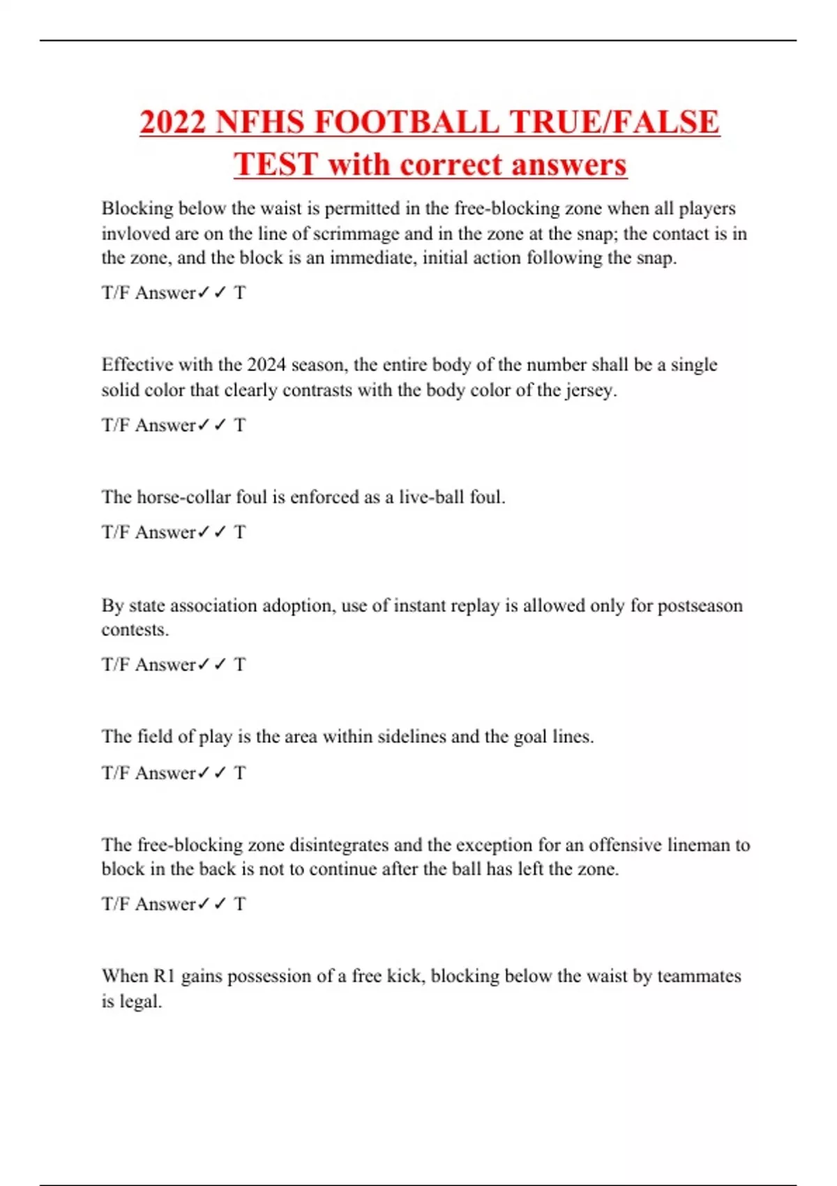 2022 NFHS FOOTBALL TRUE/FALSE TEST with correct answers