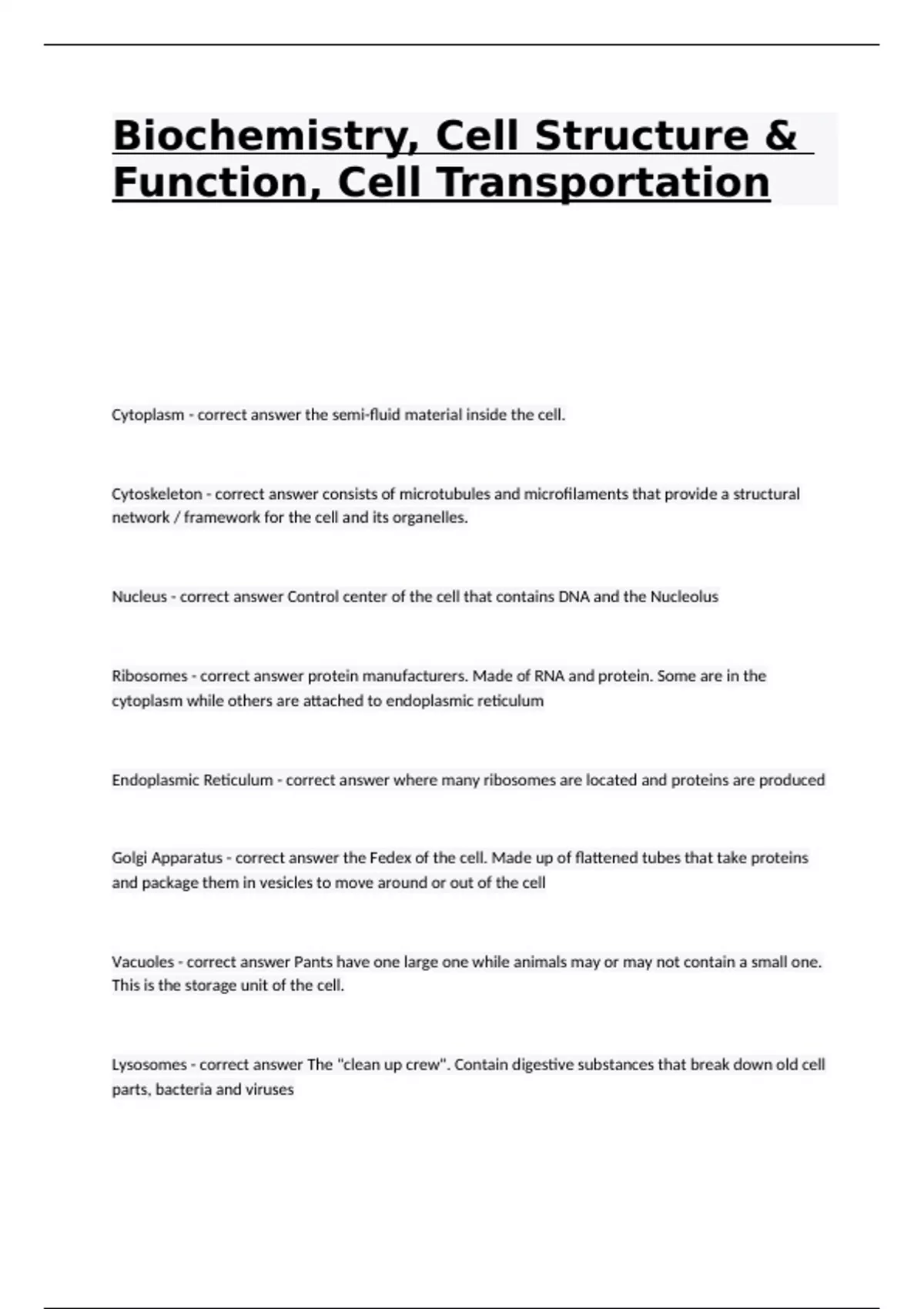 Biochemistry, Cell Structure & Function, Cell Transportation Cytoplasm - correct answer the semi-fluid material inside the cell. Cytoskeleton - correct answer consists of microtubules and microfilaments that provide a structural network / framework for the cell and its organelles. Nucleus - correct answer Control center of the cell that contains DNA and the Nucleolus Ribosomes - correct answer protein manufacturers. Made of RNA and protein. Some are in the cytoplasm while others are attached to endoplasmic reticulum Endoplasmic Reticulum - correct answer where many ribosomes are located and proteins are produced Golgi Apparatus - correct answer the Fedex of the cell. Made up of flattened tubes that take proteins and package them in vesicles to move around or out of the cell Vacuoles - correct answer Pants have one large one while animals may or may not contain a small one. This is the storage unit of the cell. Lysosomes - correct answer The "clean up crew". Contain digestive substances that break down old cell parts, bacteria and viruses Centrioles - correct answer are microtubules located in the cytoplasm of the cell near the nucleus that aid in cell division Mitochondria - correct answer convert food particles to usable energy. Inner folded membrane provides large surface area for this breakdown to take place. Cholorplasts - correct answer A type of plastid that captures and converts sunlight into chemical energy. thylakoids - correct answer stacked discs filled with chlorophyll where sunlight is captured for photosynthesis Cell Wall - correct answer Rigid mesh of fibers (cellulose) in plants that gives plants rigidity and structure Cilia - correct answer They work to move the organism in space and or move things along the surface of an organism. Short projections and numerous along the cell Dynamic Equilibrium - correct answer equal distribution of dissolved particles throughout the solution Facilitated diffusion - correct answer occurs when particles move through the plasma membrane by way of channel proteins or a carrier proteins Carrier proteins - correct answer change shape as the diffusion process continues to help move the particle through the membrane Channel proteins - correct answer opens and closes to allow the substance to diffuse through the plasma membrane Osmosis - correct answer the diffusion of water across a selectively permeable membrane Isotonic - correct answer same concentration of water and solute cells retain normal shape Hypertonic - correct answer more solute outside the cell than inside causes water to move toward the solute and out of the cell cells shrink, plants will wilt Hypotonic - correct answer there is more solute inside the cell than outside causes water to move into the cell towards the solute cell swells, plant tissues become firmer Reactants - correct answer Starting substances on the left side The arrow is read as... - correct answer Reacts to form Products - correct answer Newly formed substances are to the right of the arrow Catalysts - correct answer decrease activation energy, speed up chemical reactions, lowers the activation energy Endothermic Reaction - correct answer A reaction that absorbs energy in the form of heat Exothermic Reaction - correct answer A reaction that releases energy in the form of heat Enzymes - correct answer Proteins that speed up chemical reactions Monosaccharides - correct answer simple sugars//glucose, fructose, galactose Disaccharides - correct answer A double sugar, consisting of two monosaccharides joined by dehydration synthesis. sucrose, lactose, maltose Polysaccharides - correct answer Carbohydrates that are made up of more than two monosaccharides. Starch, glycogen and cellulose Carbohydrates - correct answer Composed of carbon, hydrogen, and oxygen. Lipids - correct answer Energy-rich organic compounds, that are made of carbon, hydrogen Fats, oils, waxes - correct answer Triglyceride - correct answer 3 fatty acids and 1 glycerol Carbohydrates are made up of... - correct answer Carbon, Hydrogen, Oxygen Lipids are made up of... - correct answer Carbon & Hydrogen Proteins are made up of... - correct answer Carbon, Hydrogen, Oxygen, Nitrogen, and Sulfur Nucleic Acids are made up of... - correct answer Carbon, Hydrogen, Oxygen, Nitrogen, and Phosphorus What are Carbohydrates subcategories - correct answer Monosaccharide, Disaccharide, Polysaccharide Carbohydrate examples... - correct answer Fructose, glucose, galatose, Sucrose,Starch, glycogen, cellulose Lipid subcategories - correct answer fats, oils, and waxes, phospholipids,steroids Lipid examples... - correct answer Triglyceride,oil, fat, wax, cholestrol Lipid Functions - correct answer Energy storage in animals Waterproof covering on leaves/stems of plants Precursor for other steroids Protein subcatgories - correct answer amino acids Protein examples - correct answer Keratin Collagen Elastin Silk Enzymes Hemoglobin Protein functions - correct answer Hair, horns, claws Makes skin elastic Spider webs and moth cocoons Guide chemical reactions Transport oxygen within tissues Nucleic Acids examples - correct answer DNA RNA Nucleic Acids functions - correct answer Genetic material of all living cells Transfers information from DNA to proteins Genetic material of some viruses and in living cells Matthias Schleiden observed - correct answer cells in plants Theodor Schwann observed - correct answer cells in animals Rudolph Virchow proposed that - correct answer all cells are made from existing cells all living organisms are - correct answer composed of 1 or more cell is the basic unit of structure and function in all living organisms - correct answer Cell All cells come from - correct answer pre existing cells and copies of their genetic material are passed on Compound Light Microscope - correct answer use light and a series of lenses to magnify Compound Light Microscope - correct answer Total magnification is calculated by multiplying the lens strengths Electron Mi