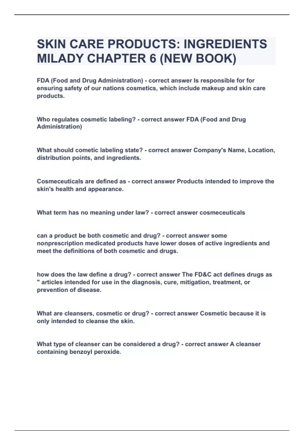 What type of cleanser can be considered a drug? - correct answer A cleanser containing benzoyl peroxide. How is a Fragrance listed? - correct answer As fragrance, the are not required to list the particular ingredients that make up the fragrance.
