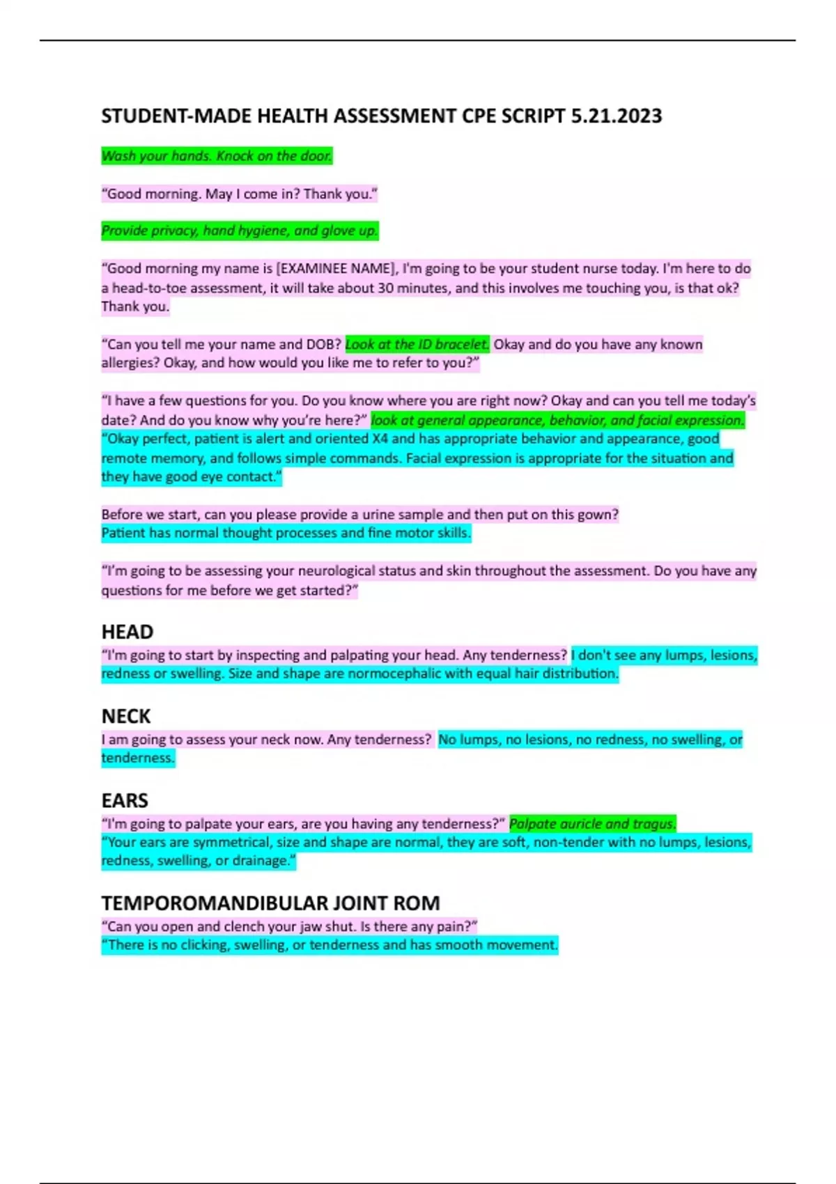 This is a study guide and practice script for CPE for health assessment