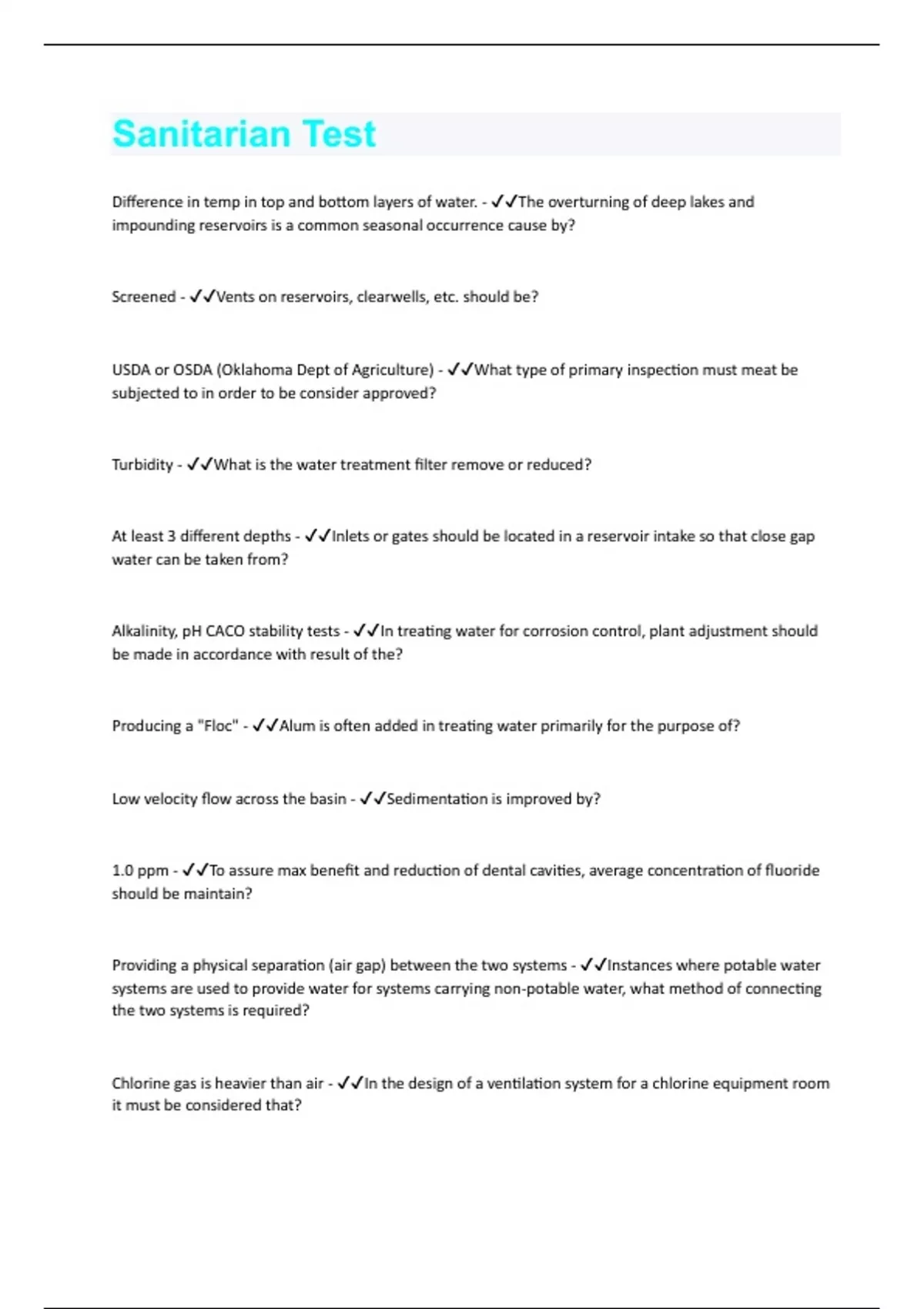 Difference in temp in top and bottom layers of water. - The overturning of deep lakes and impounding reservoirs is a common seasonal occurrence cause by? Screened - Vents on reservoirs, clearwells, etc. should be? USDA or OSDA (Oklahoma Dept of Agriculture) - What type of primary inspection must meat be subjected to in order to be consider approved? Turbidity - What is the water treatment filter remove or reduced? At least 3 different depths - Inlets or gates should be located in a reservoir intake so that close gap water can be taken from? Alkalinity, pH CACO stability tests - In treating water for corrosion control, plant adjustment should be made in accordance with result of the? Producing a "Floc" - Alum is often added in treating water primarily for the purpose of? Low velocity flow across the basin - Sedimentation is improved by? 1.0 ppm - To assure max benefit and reduction of dental cavities, average concentration of fluoride should be maintain? Providing a physical separation (air gap) between the two systems - Instances where potable water systems are used to provide water for systems carrying non-potable water, what method of connecting the two systems is required?