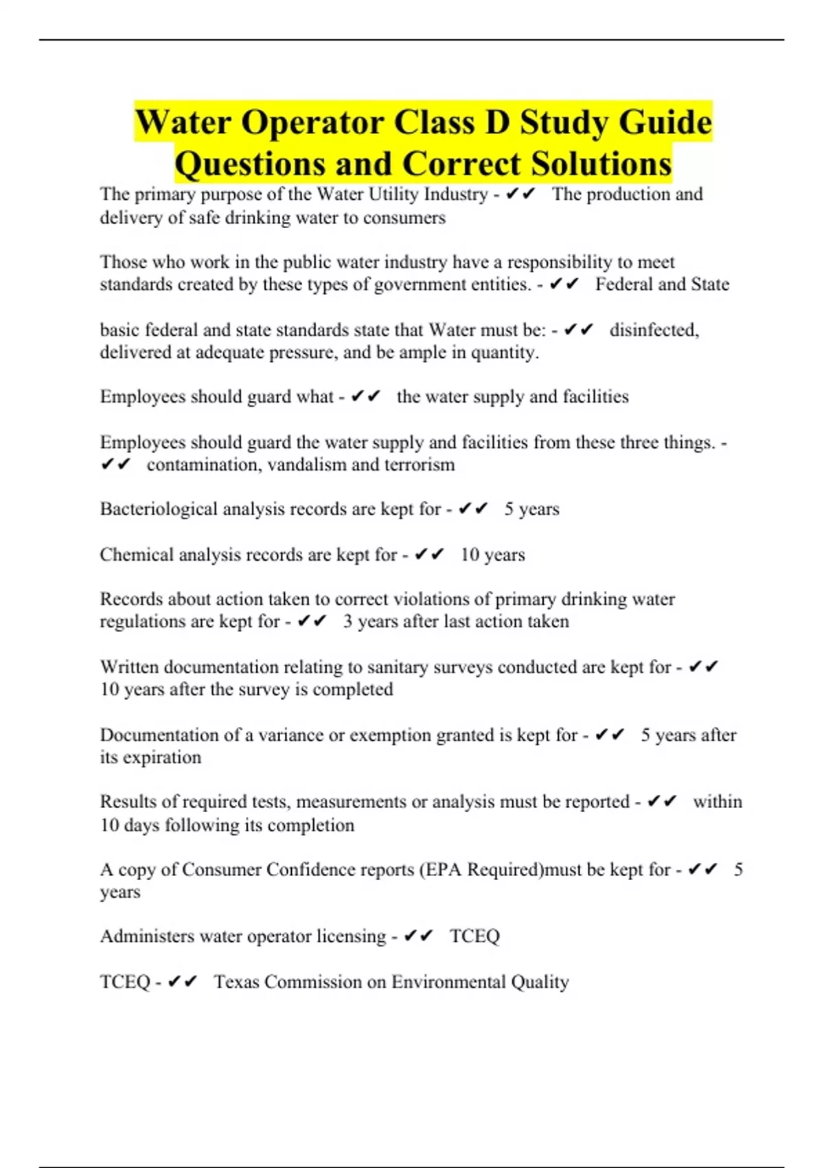 Water Operator Class D Study Guide Questions and Correct Solutions