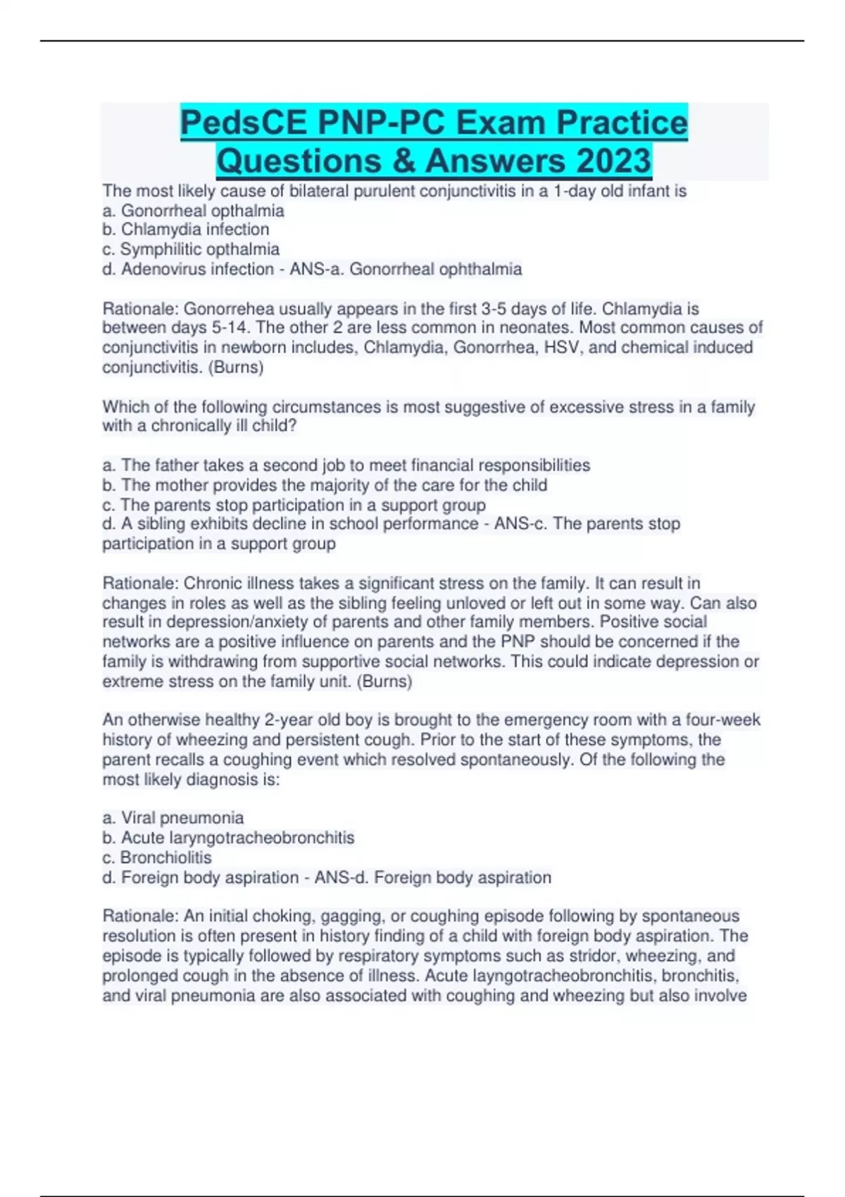 PedsCE PNP-PC Exam Practice Questions & Answers 2023 The most likely cause of bilateral purulent conjunctivitis in a 1-day old infant is a. Gonorrheal opthalmia b. Chlamydia infection c. Symphilitic opthalmia d. Adenovirus infection - ANS-a. Gonorrheal ophthalmia Rationale: Gonorrehea usually appears in the first 3-5 days of life. Chlamydia is between days 5-14. The other 2 are less common in neonates. Most common causes of conjunctivitis in newborn includes, Chlamydia, Gonorrhea, HSV, and chemical induced conjunctivitis. (Burns) Which of the following circumstances is most suggestive of excessive stress in a family with a chronically ill child? a. The father takes a second job to meet financial responsibilities b. The mother provides the majority of the care for the child c. The parents stop participation in a support group d. A sibling exhibits decline in school performance - ANS-c. The parents stop participation in a support group Rationale: Chronic illness takes a significant stress on the family. It can result in changes in roles as well as the sibling feeling unloved or left out in some way. Can also result in depression/anxiety of parents and other family members. Positive social networks are a positive influence on parents and the PNP should be concerned if the family is withdrawing from supportive social networks. This could indicate depression or extreme stress on the family unit. (Burns) An otherwise healthy 2-year old boy is brought to the emergency room with a four-week history of wheezing and persistent cough. Prior to the start of these symptoms, the parent recalls a coughing event which resolved spontaneously. Of the following the most likely diagnosis is: a. Viral pneumonia b. Acute laryngotracheobronchitis c. Bronchiolitis d. Foreign body aspiration - ANS-d. Foreign body aspiration Rationale: An initial choking, gagging, or coughing episode following by spontaneous resolution is often present in history finding of a child with foreign body aspiration. The episode is typically followed by respiratory symptoms such as stridor, wheezing, and prolonged cough in the absence of illness. Acute layngotracheobronchitis, bronchitis, and viral pneumonia are also associated with coughing and wheezing but also involve other symptoms such as fever, rhinorrhea, fatigue and usually resolve within 10-14 days. (Nelson Textbook of Pediatrics 20th edition, Chapter 327) The sexual development of a 14-year old girl is notably delayed. She is very short, slightly obese, and complains of constipation and fatigue. Her skin is sallow and coarse in texture, and her hair is brittle. Which of the following tests should be obtained? a. Serum leutinizing hormone and chromosome analysis b. Serum thyroxine and thryroid-stimulating hormone c. Chromosome analysis and serum thyroxine d. Serum leutinizing hormone and thyroid stimulating hormone - ANS-b. Serum thyroxine and thryroid-stimulating hormone Rationale: Classic symptoms of growth failure, goiter, delayed or arrested puberty, delayed dentition, weight gain, fatigue, dry skin, hyperlipidemia, decline in school performance, menorrhagia, and fatigue. It would be most appropriate to test for hypothyroidism first in this patient. If these are normal then you may want to consider the other tests for reasons for her growth delay etc. (Burns) Which of the following children requires a language referral for further evaluation? a. 1-year-old with a 5-word vocabulary b. 2-year-old who cannot put two words together c. 2-year-old with a 30-word vocabulary d. 3-year-old who is understandable to parents - ANS-b. 2-year-old who cannot put two words together Rationale: A 1 year old can have ~5 words with normal development, a 2 year old should have 20+ words, and by the age of 3 the child should be fully understandable by parents and 90% intelligible by strangers. A 2 year old should be able to put 2 word sentences together so if this milestone is not present then the patient needs further evaluation to assess for language delays. (Burns, Bright Futures) A pediatric primary care nurse practitioner observes multiple oval macules, both hyperpigmented and hypopigmented, on a child's upper trunk. A fine scale surrounds the borders of the lesions. The diagnosis is: a. Atopic dermatitis b. Keratosis pilaris c. Pityriasis rosea d. Tinea versicolor - ANS-d. Tinea versicolor Rationale: Tinea versicolor is a common dermatosis characterized by multiple small, oval, scaly patches measuring 1 to 3 cm in diameter, usually located in a raindrop pattern on the upper chest, back, and proximal portions of the upper extremities. In children, atopic dermatitis lesions are typically dry, papular, and intensely pruritic. Circumscribed scaly patches are distributed on the wrists, ankles, and antecubital and popliteal fossae. Keratosis Pilaris is typically distributed on the posterior upper portion of the arms and lesions are dry and papular. With Pityriasis rosea, a prodrome of malaise, headache, and mild constitutional symptoms occasionally precedes the rash but is not crucial for diagnosis. The typical eruption begins with the appearance of one or multiple "herald patches" which are large, isolated, oval lesions, usually pink in color and slightly scaly; they may occur anywhere on the body. From 5 to 10 days later, other smaller oval lesions appear on the body, frequently concentrated over the trunk but also seen on the proximal extremities, especially the thighs. (Zitelli and Davis' Atlas of Pediatric Physical Diagnosis, Chapter 8) A five-year-old child's physical examination is normal and the child has no known allergies to foods or medications. To date, the child has not been immunized and has had varicelladisease. The pediatric primary care nurse practitioner now administers a poliovirus vaccine, a diphtheria, tetanus, and acellular pertussis vaccine; a measles, mumps, and rubella virus vaccine, and a: Continues...