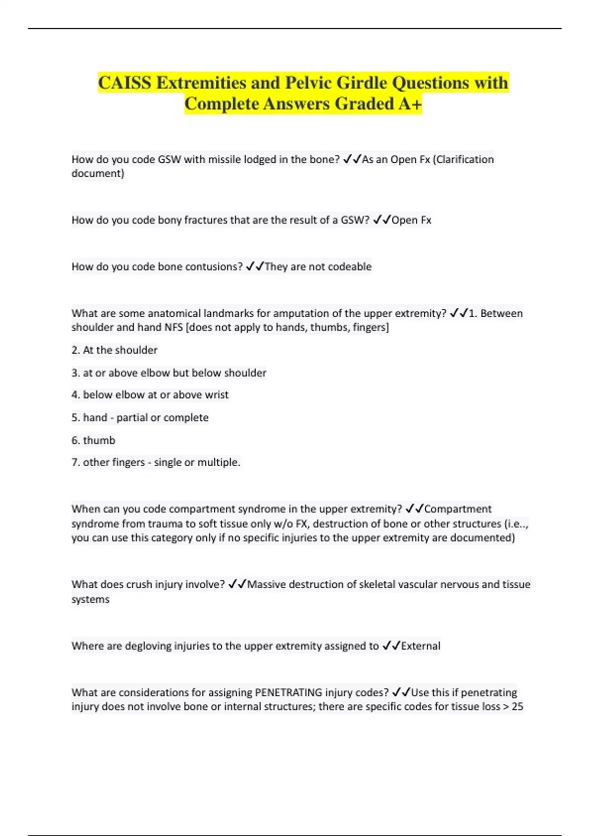 CAISS Extremities and Pelvic Girdle Questions with Complete Answers Graded A+ How do you code GSW with missile lodged in the bone? As an Open Fx (Clarification document) How do you code bony fractures that are the result of a GSW? Open Fx How do you code bone contusions? They are not codeable What are some anatomical landmarks for amputation of the upper extremity? 1. Between shoulder and hand NFS [does not apply to hands, thumbs, fingers] 2. At the shoulder 3. at or above elbow but below shoulder 4. below elbow at or above wrist 5. hand - partial or complete 6. thumb 7. other fingers - single or multiple. When can you code compartment syndrome in the upper extremity? Compartment syndrome from trauma to soft tissue only w/o FX, destruction of bone or other structures (i.e.., you can use this category only if no specific injuries to the upper extremity are documented) What does crush injury involve? Massive destruction of skeletal vascular nervous and tissue systems Where are degloving injuries to the upper extremity assigned to External What are considerations for assigning PENETRATING injury codes? Use this if penetrating injury does not involve bone or internal structures; there are specific codes for tissue loss > 25 cm²; there are codes for blood loss > 20% for penetrating injuries at the shoulder or at or above the elbow, below the shoulder. Describe a major laceration to the upper extremity It is more than 10 cm long on the hand or greater than 20 cm long on the entire extremity and into the subcutaneous tissue What is the difference between a minor and major avulsion on the upper extremity? A minor or superficial is </= to 25 cm² on the hand or </= 100 cm² on the entire extremity. A major avulsion is tissue loss > 25 cm on the hand or > 100 cm² on the entire extremity