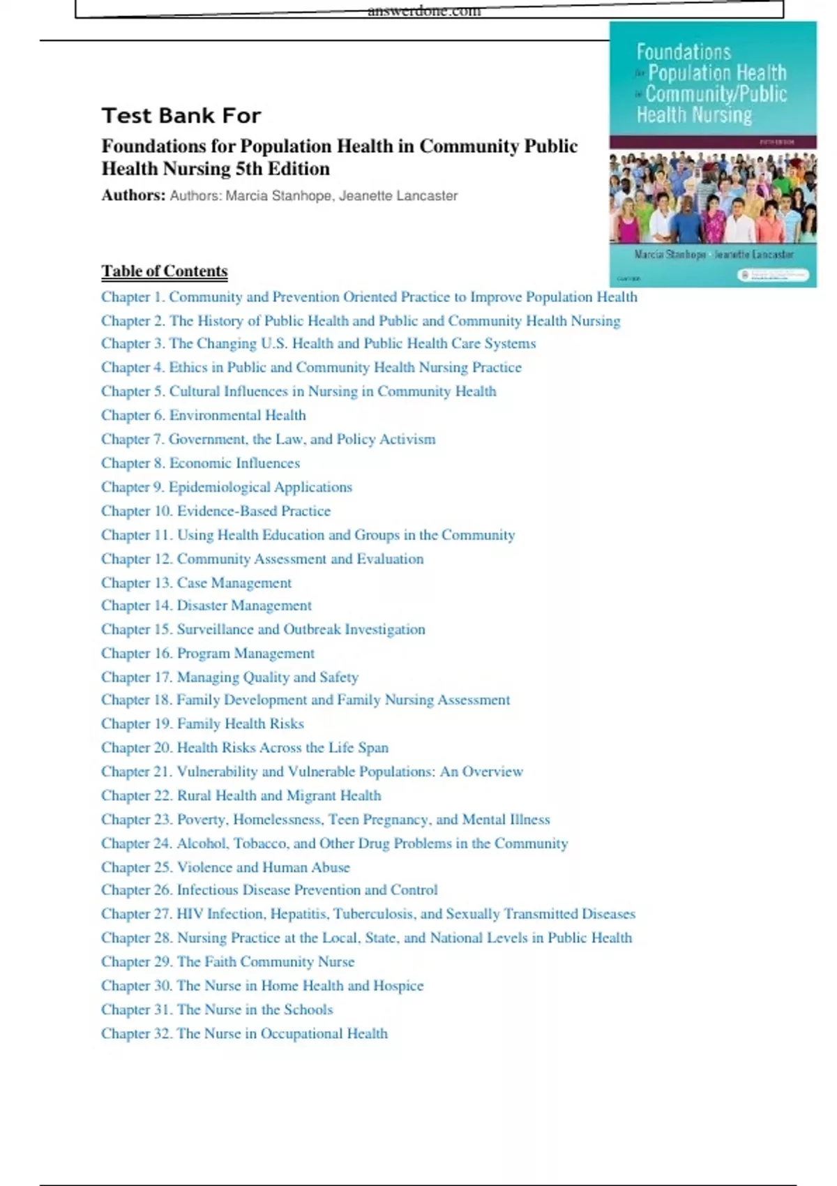 Foundations for Population Health in Community Public Health Nursing 5th Edition Authors: Authors: Marcia Stanhope, Jeanette Lancaster Foundations for Population Health in Community Public Health Nursing 5th Edition Authors: Authors: Marcia Stanhope, Jeanette Lancaster