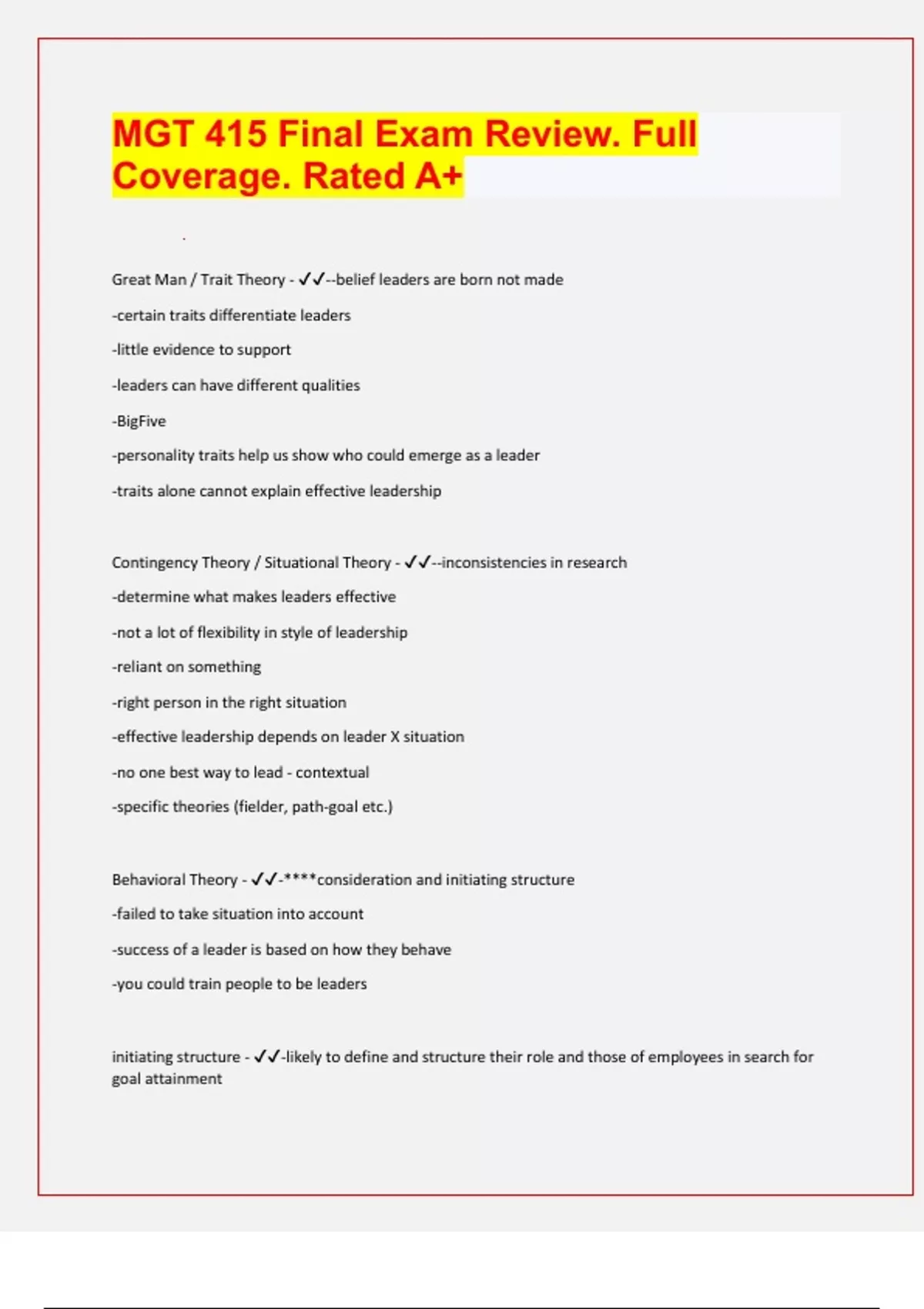 MGT 415 Final Exam Review. Full Coverage. Rated A+ Great Man / Trait Theory - --belief leaders are born not made -certain traits differentiate leaders -little evidence to support -leaders can have different qualities -BigFive -personality traits help us show who could emerge as a leader -traits alone cannot explain effective leadership Contingency Theory / Situational Theory - --inconsistencies in research -determine what makes leaders effective -not a lot of flexibility in style of leadership -reliant on something -right person in the right situation -effective leadership depends on leader X situation -no one best way to lead - contextual -specific theories (fielder, path-goal etc.) Behavioral Theory - -****consideration and initiating structure -failed to take situation into account -success of a leader is based on how they behave -you could train people to be leaders initiating structure - -likely to define and structure their role and those of employees in search for goal attainment consideration - -likely to have job relationships that are characterized by mutual trust, respect for employee's ideas and regard for their feelings Leader-member exchange theory - --in groups vs out groups -dynamic between leader and followers based on quality of exchange / relationship in groups - -more like leader and given more attention out group - -abuses power and given a lot of burden advantages of new models of leadership compared to early theories of leadership - --different aspects of leaders -highlights importance of emotions -looks not at what leaders do but how they communicate, inspire and create change Charismatic leadership - --emerge in high crisis situations -vision= long term strategy to reach a goal (gives direction) -combination of traits- self-confidence, energy, conviction about ideas, expressiveness, extraordinary communication abilities -absolute confidence, positive emotion, high enery -triangle between leader characteristics, situation characteristics and follower characteristics Transactional leaderhship - --exchange -contingent reward mgt by exception fallback: extrinsic reward Transformational leadership - --use personal traits to go beyond exchange of resources -charisma --> trust -intellectual stimulation --> seek solutions -individual consideration --> feeling of being special -not simple to teach and different for each leader -intrinsic -change -4 I's (inspiration, intellectual, individual consideration and influence) -how to change direction Authentic leadership - --understand your own strengths and develop them -practice solid values -lead with heart -connect with followers