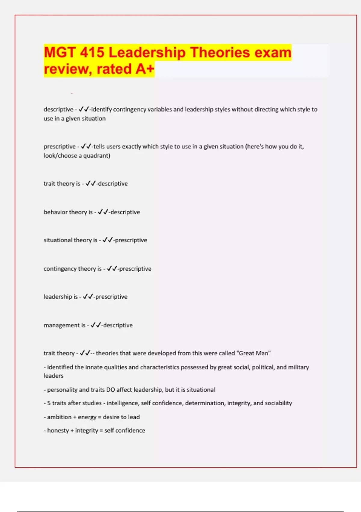 Summary MGT 415 Leadership Theories exam review, rated A+