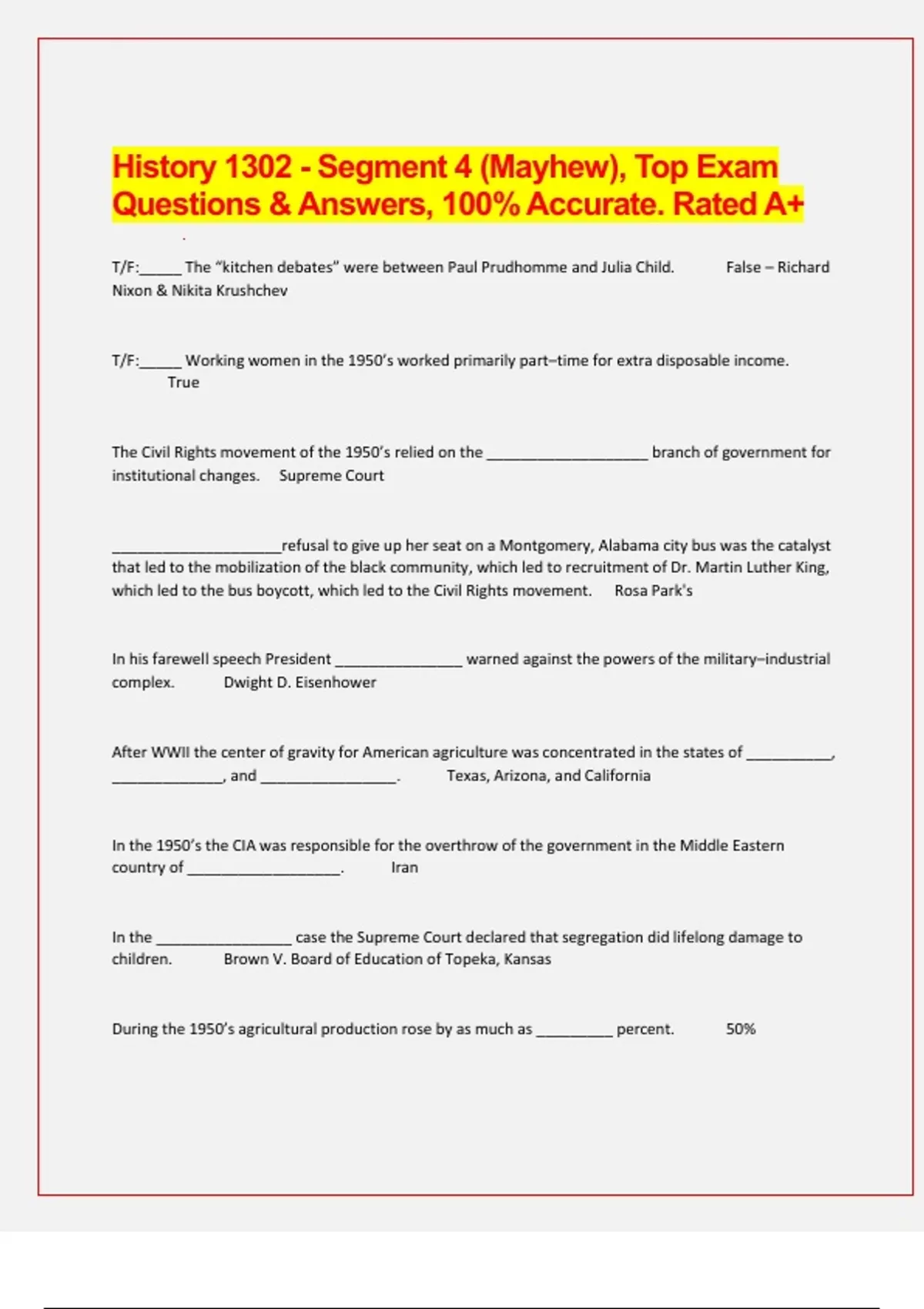 History 1302 - Segment 4 (Mayhew), Top Exam Questions & Answers, 100% Accurate. Rated A+ T/F:_____ The “kitchen debates” were between Paul Prudhomme and Julia Child. False – Richard Nixon & Nikita Krushchev T/F:_____ Working women in the 1950’s worked primarily part–time for extra disposable income. True The Civil Rights movement of the 1950’s relied on the ___________________ branch of government for institutional changes. Supreme Court ____________________refusal to give up her seat on a Montgomery, Alabama city bus was the catalyst that led to the mobilization of the black community, which led to recruitment of Dr. Martin Luther King, which led to the bus boycott, which led to the Civil Rights movement. Rosa Park's In his farewell speech President _______________ warned against the powers of the military–industrial complex. Dwight D. Eisenhower After WWII the center of gravity for American agriculture was concentrated in the states of __________, _____________, and ________________. Texas, Arizona, and California In the 1950’s the CIA was responsible for the overthrow of the government in the Middle Eastern country of __________________. Iran In the ________________ case the Supreme Court declared that segregation did lifelong damage to children. Brown V. Board of Education of Topeka, Kansas During the 1950’s agricultural production rose by as much as _________ percent. 50% During the 1950’s _______________ was indirectly responsible for changing the eating schedules for many Americans. Television T/F:_____ During the 1950’s wage disparities between women and men virtually disappeared. False – 59–64 cents/dollar The __________________ bus boycott ended with the ruling by the Supreme Court that segregation in public transportation was illegal. Montgomery, Alabama In response to the refusal of the Arkansas National Guard to admit, and protect, incoming black students at Central High School, in Little Rock, Arkansas, President _______________ replaced the Guard with federal troops. Eisenhower In1960 the Catholicism of _______________ was considered to be a handicap in the presidential race. John F. Kennedy The1960 presidential debate between _______________ and ________________ showed the impact Television would have on future political campaigns. John F. Kennedy & Richard M. Nixon T/F:_____ In his April 1963 “Letter from a Birmingham Jail” martin Luther King announced he was abandoning his policy of peaceful civil disobedience. False The1964, ________________ Act did not address laws that suppressed suffrage. Civil Rights Act It can be argued that the book _____________ helped to launch the environmental movement. Silent Spring by Rachel Carson The ______________ Court effectively agreed that the family unit was a collection of sovereign individuals rather than a unit with a single male head. Warren Court The1964 campaign of presidential candidate _______________ emphasized the need for a reduction in governmental regulations. Republican Barry Goldwater T/F:_____ in 1963 the Birmingham, Alabama Fire Department refused to participate in the attacks on the civil rights demonstrators. False With the passage of the __________ lyndon Johnson remarked, "I think we have just delivered the south to the Republican party." 1964 Civil Rights Act Cesar Estrada Chavez was the co–founder and spokesman for the _______________. National Farm Workers Union T/F:_____ By the end of the 1960's, some 70,000 demonstrators had taken part in sit–ins across the south to protest desegregation. True The organization known as _________________ launched the Freedom Rides to test the Supreme Court order banning segregation in interstate transportation. Congress of Racial Equality – CORE In his correspondence titled ___________________ Martin Luther King discussed a litany of abuses faced by blacks in the South and the need for change. Letter from Birmingham Jail The ________________ brought the U.S. and the U.S.S.R. to the brink of nuclear war. Cuban Missile Crisis The 1965 ___________ empowered the federal government to oversee voter registration. Voting Rights Act The _____________ offered a new vision for social change based on participatory democracy. Port Huron Statement The________________ authorized the president to “take all necessary steps to repel armed attack” in Vietnam. Golf of Tonkin Resolution By 1968 America had over _____________ troops in Vietnam. 500,000