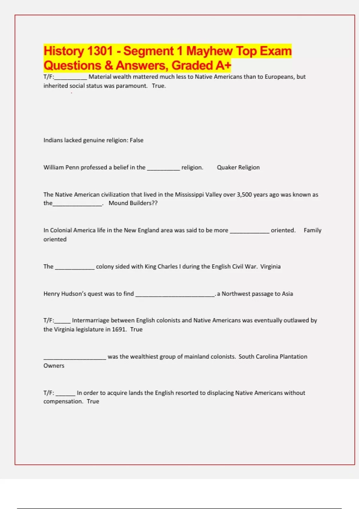 History 1301 - Segment 1 Mayhew Top Exam Questions & Answers, Graded A+