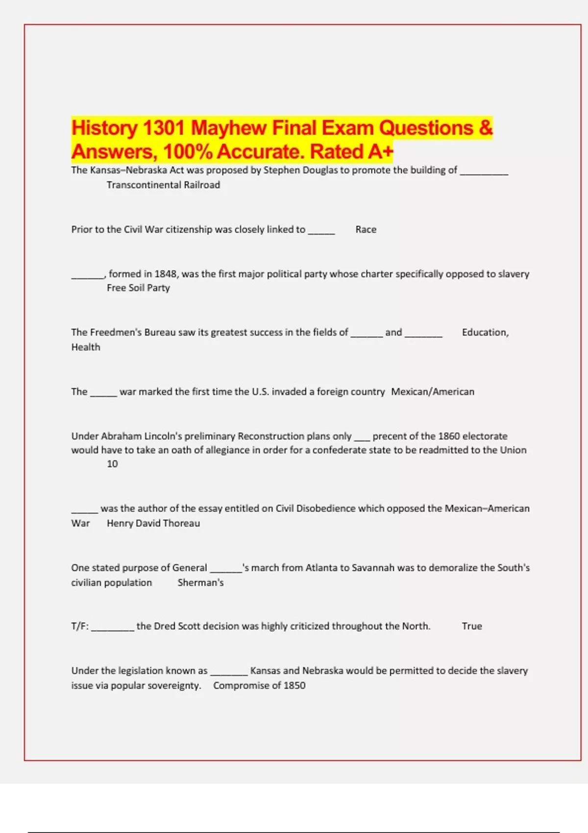 History 1301 Mayhew Final Exam Questions & Answers, 100% Accurate. Rated A+ The Kansas–Nebraska Act was proposed by Stephen Douglas to promote the building of _________ Transcontinental Railroad Prior to the Civil War citizenship was closely linked to _____ Race ______, formed in 1848, was the first major political party whose charter specifically opposed to slavery Free Soil Party