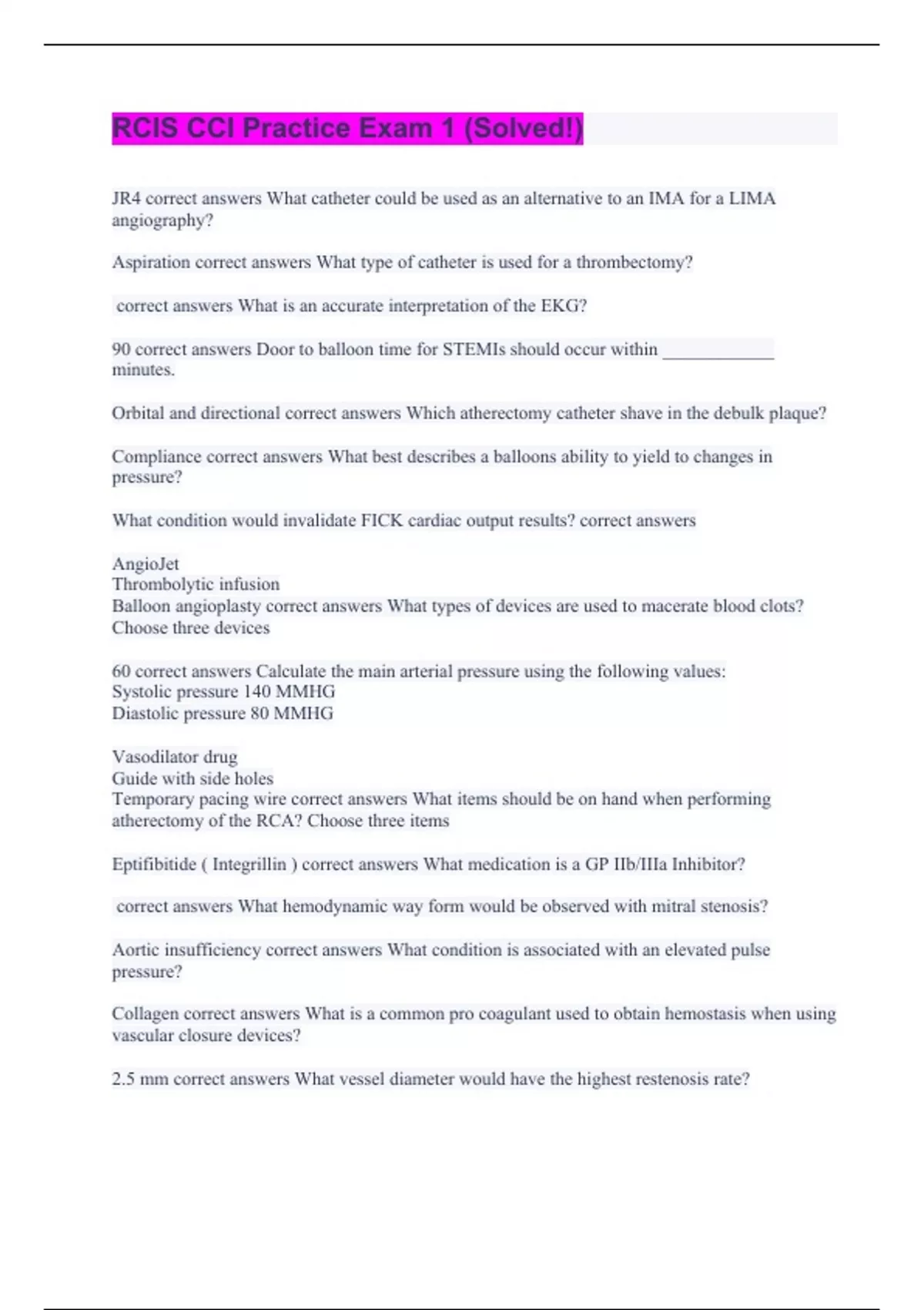 JR4 correct answers What catheter could be used as an alternative to an IMA for a LIMA angiography? Aspiration correct answers What type of catheter is used for a thrombectomy? correct answers What is an accurate interpretation of the EKG? 90 correct answers Door to balloon time for STEMIs should occur within ____________ minutes. Orbital and directional correct answers Which atherectomy catheter shave in the debulk plaque? Compliance correct answers What best describes a balloons ability to yield to changes in pressure? What condition would invalidate FICK cardiac output results? correct answers AngioJet Thrombolytic infusion Balloon angioplasty correct answers What types of devices are used to macerate blood clots? Choose three devices 60 correct answers Calculate the main arterial pressure using the following values: Systolic pressure 140 MMHG Diastolic pressure 80 MMHG Vasodilator drug Guide with side holes Temporary pacing wire correct answers What items should be on hand when performing atherectomy of the RCA? Choose three items Eptifibitide ( Integrillin ) correct answers What medication is a GP IIb/IIIa Inhibitor? correct answers What hemodynamic way form would be observed with mitral stenosis? Aortic insufficiency correct answers What condition is associated with an elevated pulse pressure? Collagen correct answers What is a common pro coagulant used to obtain hemostasis when using vascular closure devices? 2.5 mm correct answers What vessel diameter would have the highest restenosis rate?