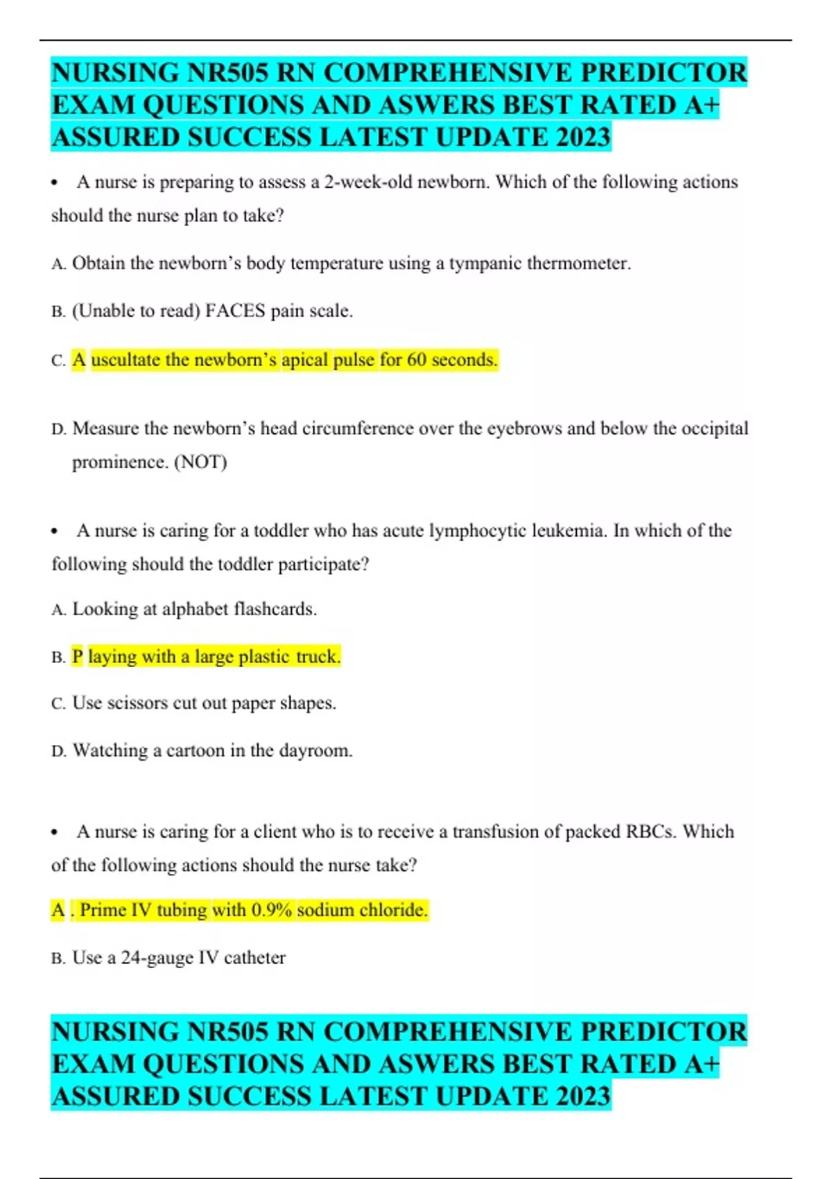NURSING NR505 RN COMPREHENSIVE PREDICTOR EXAM QUESTIONS AND ASWERS BEST RATED A+ ASSURED SUCCESS LATEST UPDATE 2023 Best explained answers guaranteed success